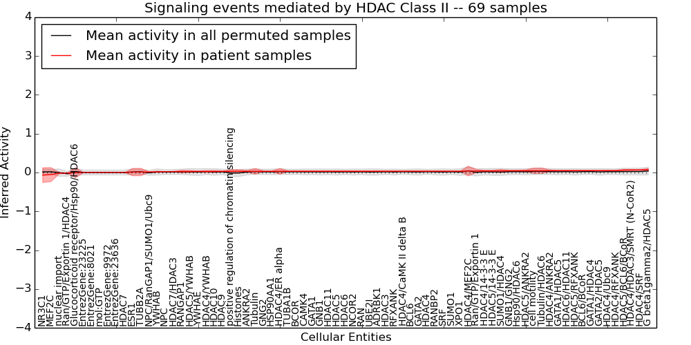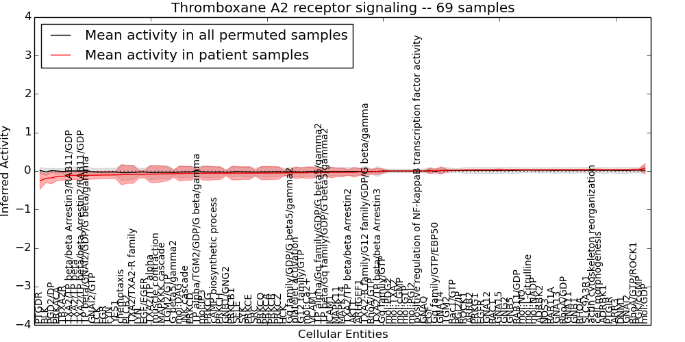 Figure S131.  Get High-res Image This plot shows pathway concept perturbations across all samples against a permutation model. The concepts along the x-axis are sorted by lowest to highest mean activity for the real patient samples. Mean inferred activities are plotted along the y-axis as a colored band showing the average level and one standard deviation range. Real samples are shown in red and permuted samples in black.