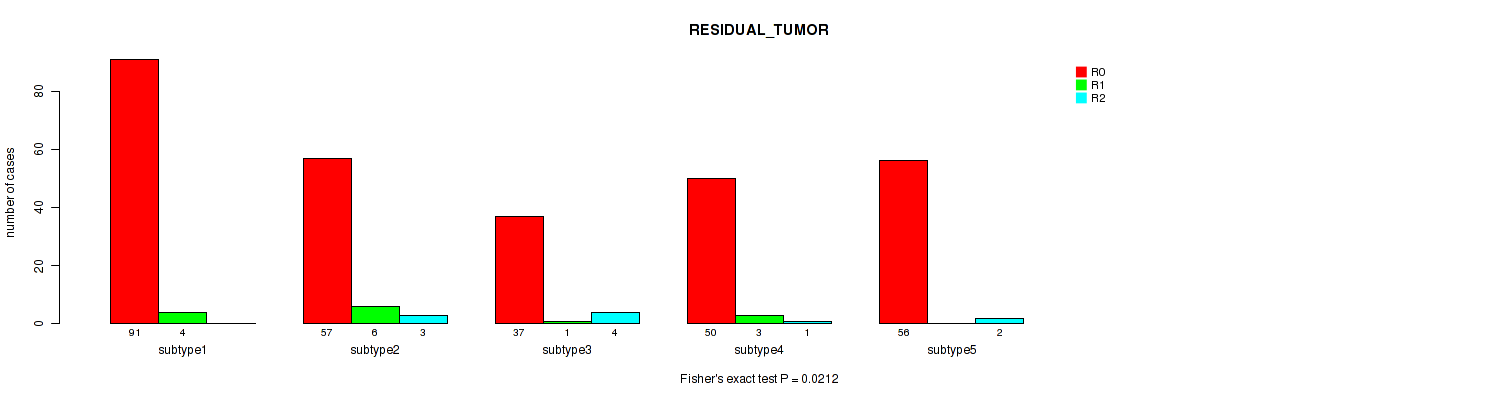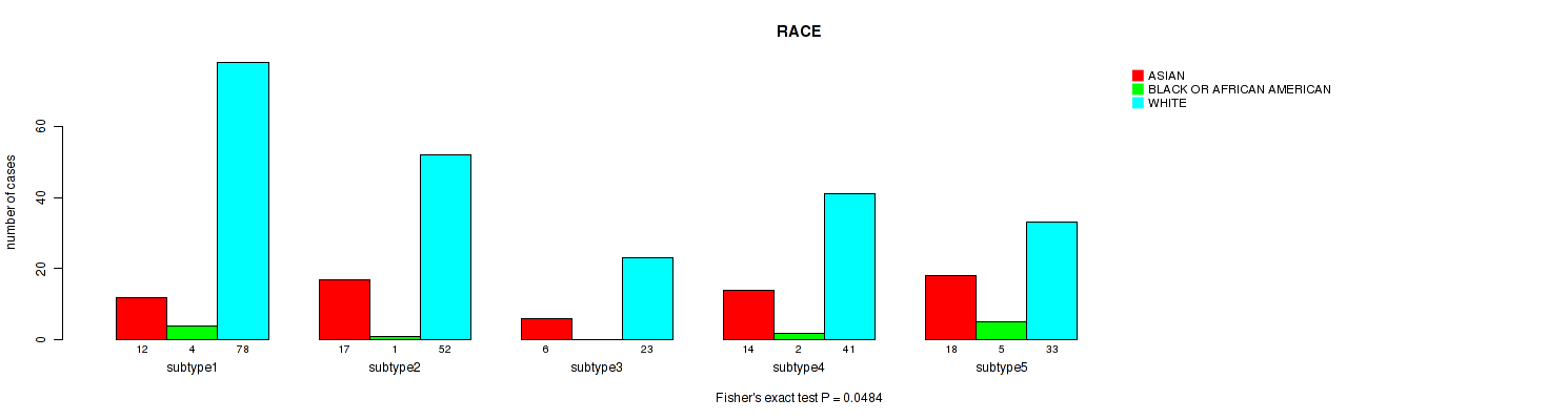 5 subtypes identified in current cancer cohort by 'MIRseq Mature cHierClus subtypes'. These subtypes correlate to 'PATHOLOGY_T_STAGE', 'HISTOLOGICAL_TYPE', 'RESIDUAL_TUMOR', and 'RACE'.