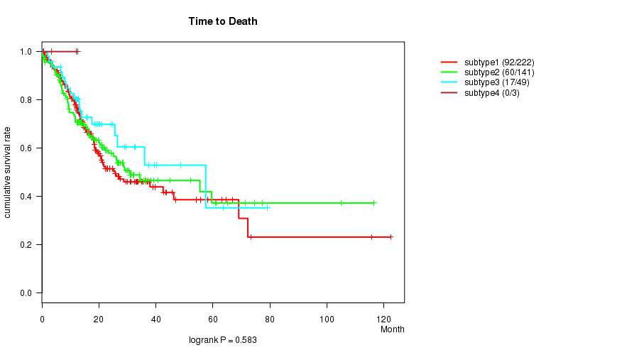 Consensus hierarchical clustering analysis on sequencing-based mRNA expression data identified 4 subtypes that correlate to 'Time to Death', 'YEARS_TO_BIRTH', 'PATHOLOGY_T_STAGE', 'PATHOLOGY_N_STAGE', 'HISTOLOGICAL_TYPE', and 'NUMBER_OF_LYMPH_NODES'.