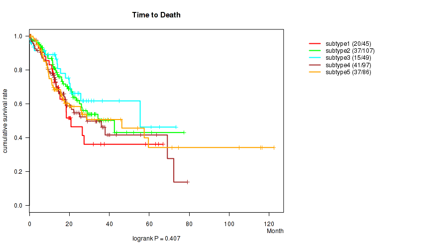 CNMF clustering analysis on sequencing-based mRNA expression data identified 5 subtypes that correlate to 'Time to Death', 'YEARS_TO_BIRTH', 'PATHOLOGY_T_STAGE', 'RADIATION_THERAPY', 'HISTOLOGICAL_TYPE', 'NUMBER_OF_LYMPH_NODES', and 'RACE'.