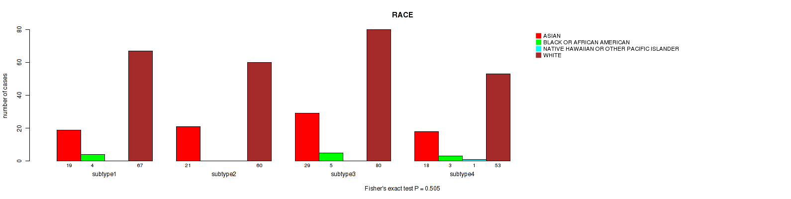 Table S139. Clustering Approach #10: 'MIRseq Mature cHierClus subtypes' versus Clinical Feature #12: 'RACE'
