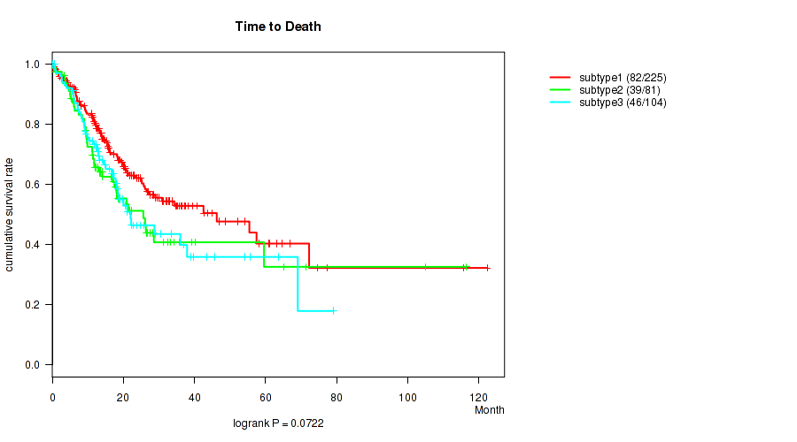 Consensus hierarchical clustering analysis on RPPA data identified 4 subtypes that correlate to 'Time to Death', 'PATHOLOGY_T_STAGE', and 'RADIATION_THERAPY'.