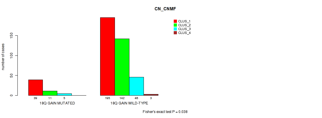 18q gain cnv correlated to 'CN_CNMF', 'METHLYATION_CNMF', 'MRNASEQ_CNMF', and 'MIRSEQ_CHIERARCHICAL'.