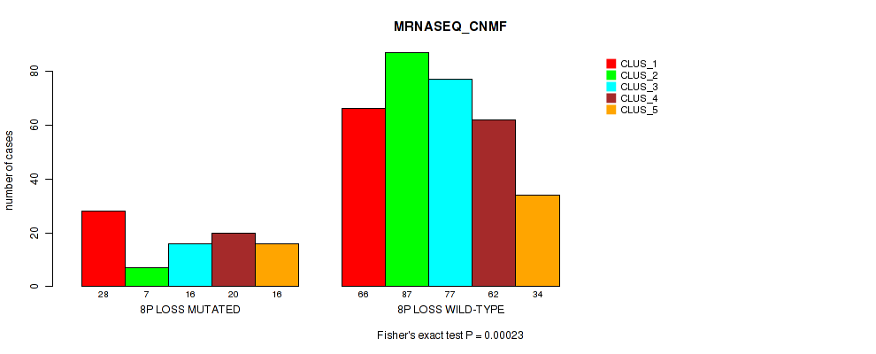 8p loss cnv correlated to 'CN_CNMF', 'METHLYATION_CNMF', 'RPPA_CNMF', 'RPPA_CHIERARCHICAL', 'MRNASEQ_CNMF', 'MRNASEQ_CHIERARCHICAL', 'MIRSEQ_CNMF', 'MIRSEQ_CHIERARCHICAL', 'MIRSEQ_MATURE_CNMF', and 'MIRSEQ_MATURE_CHIERARCHICAL'.