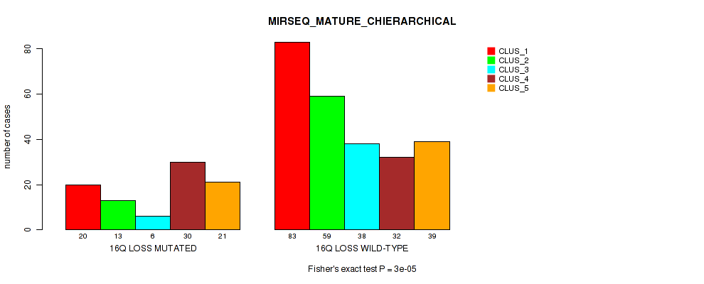 16q loss cnv correlated to 'CN_CNMF', 'METHLYATION_CNMF', 'MRNASEQ_CNMF', 'MRNASEQ_CHIERARCHICAL', 'MIRSEQ_CNMF', 'MIRSEQ_CHIERARCHICAL', 'MIRSEQ_MATURE_CNMF', and 'MIRSEQ_MATURE_CHIERARCHICAL'.