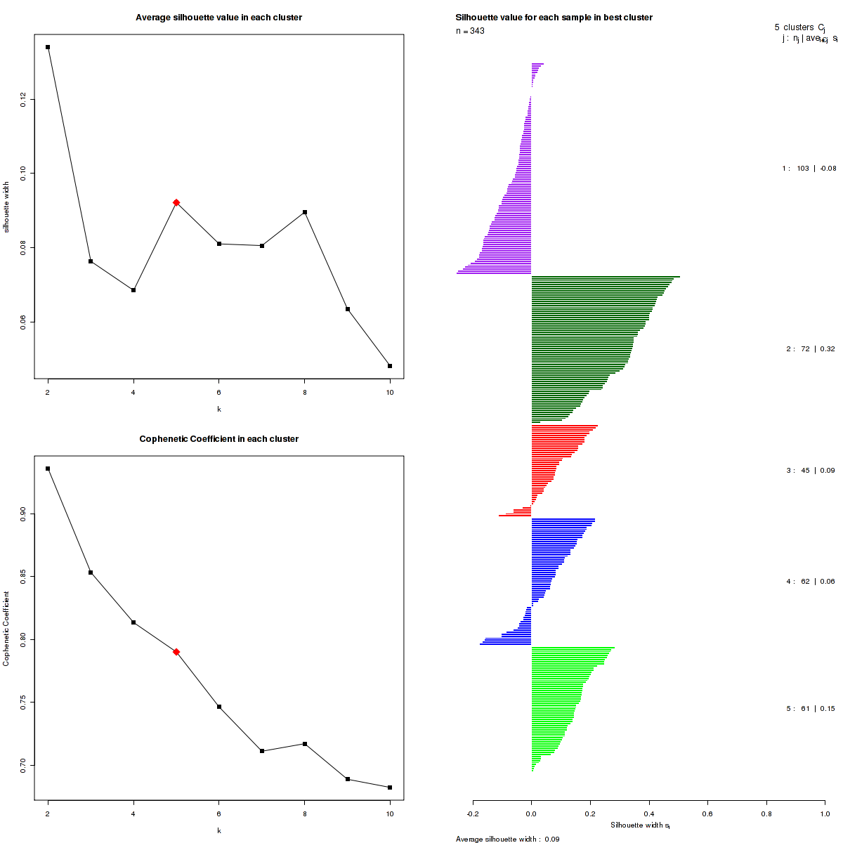 The cophenetic correlation coefficients and average silhouette values are used to determine the k with the most robust clusterings. From the plot of cophenetic correlation versus k, we select modes and the the point preceding the greatest decrease in cophenetic correlation coefficient, and from these choose the k with the highest average silhouette value.