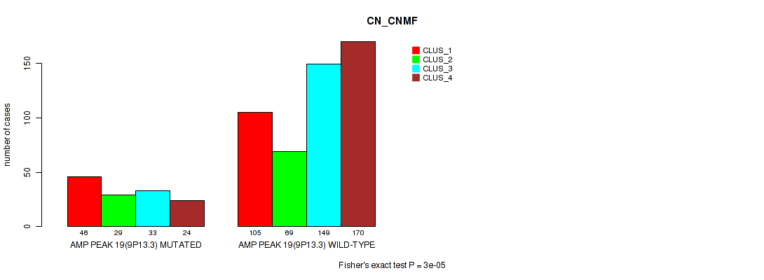 • del_19p13.3 cnv correlated to 'CN_CNMF',  'METHLYATION_CNMF',  'RPPA_CNMF',  'RPPA_CHIERARCHICAL',  'MRNASEQ_CNMF',  'MRNASEQ_CHIERARCHICAL',  'MIRSEQ_CNMF',  'MIRSEQ_CHIERARCHICAL',  'MIRSEQ_MATURE_CNMF', and 'MIRSEQ_MATURE_CHIERARCHICAL'.