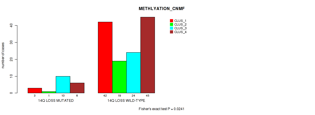 14q loss cnv correlated to 'METHLYATION_CNMF', 'RPPA_CNMF', 'MRNASEQ_CNMF', 'MRNASEQ_CHIERARCHICAL', 'MIRSEQ_CNMF', 'MIRSEQ_CHIERARCHICAL', 'MIRSEQ_MATURE_CNMF', and 'MIRSEQ_MATURE_CHIERARCHICAL'.