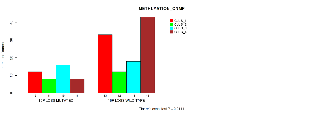 16p loss cnv correlated to 'METHLYATION_CNMF', 'MIRSEQ_CNMF', and 'MIRSEQ_CHIERARCHICAL'.