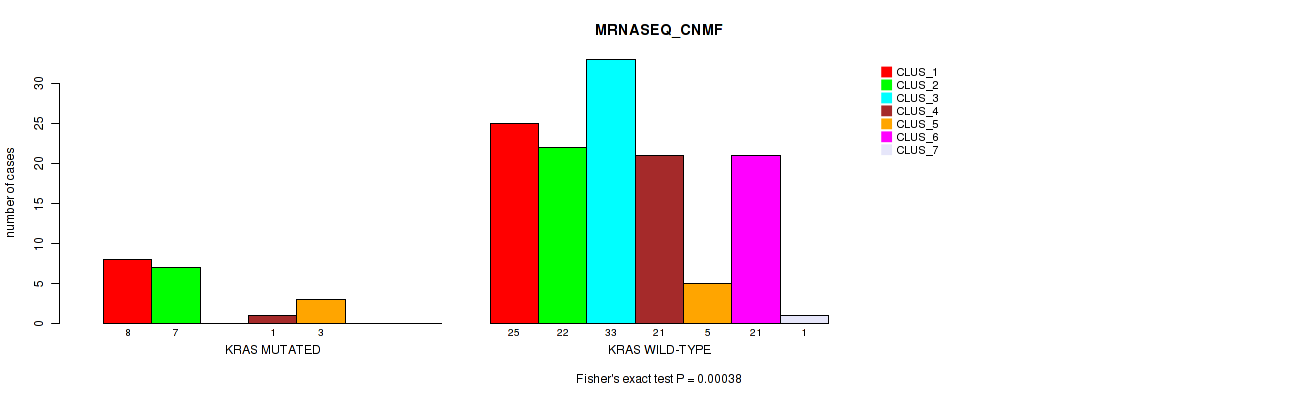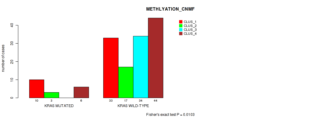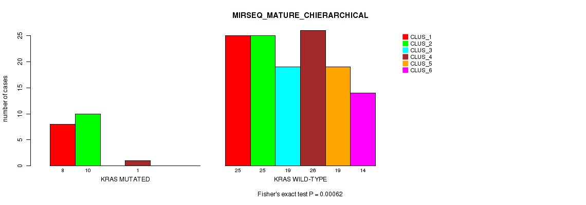 KRAS mutation correlated to 'CN_CNMF', 'METHLYATION_CNMF', 'RPPA_CNMF', 'RPPA_CHIERARCHICAL', 'MRNASEQ_CNMF', 'MRNASEQ_CHIERARCHICAL', 'MIRSEQ_CNMF', 'MIRSEQ_CHIERARCHICAL', 'MIRSEQ_MATURE_CNMF', and 'MIRSEQ_MATURE_CHIERARCHICAL'.