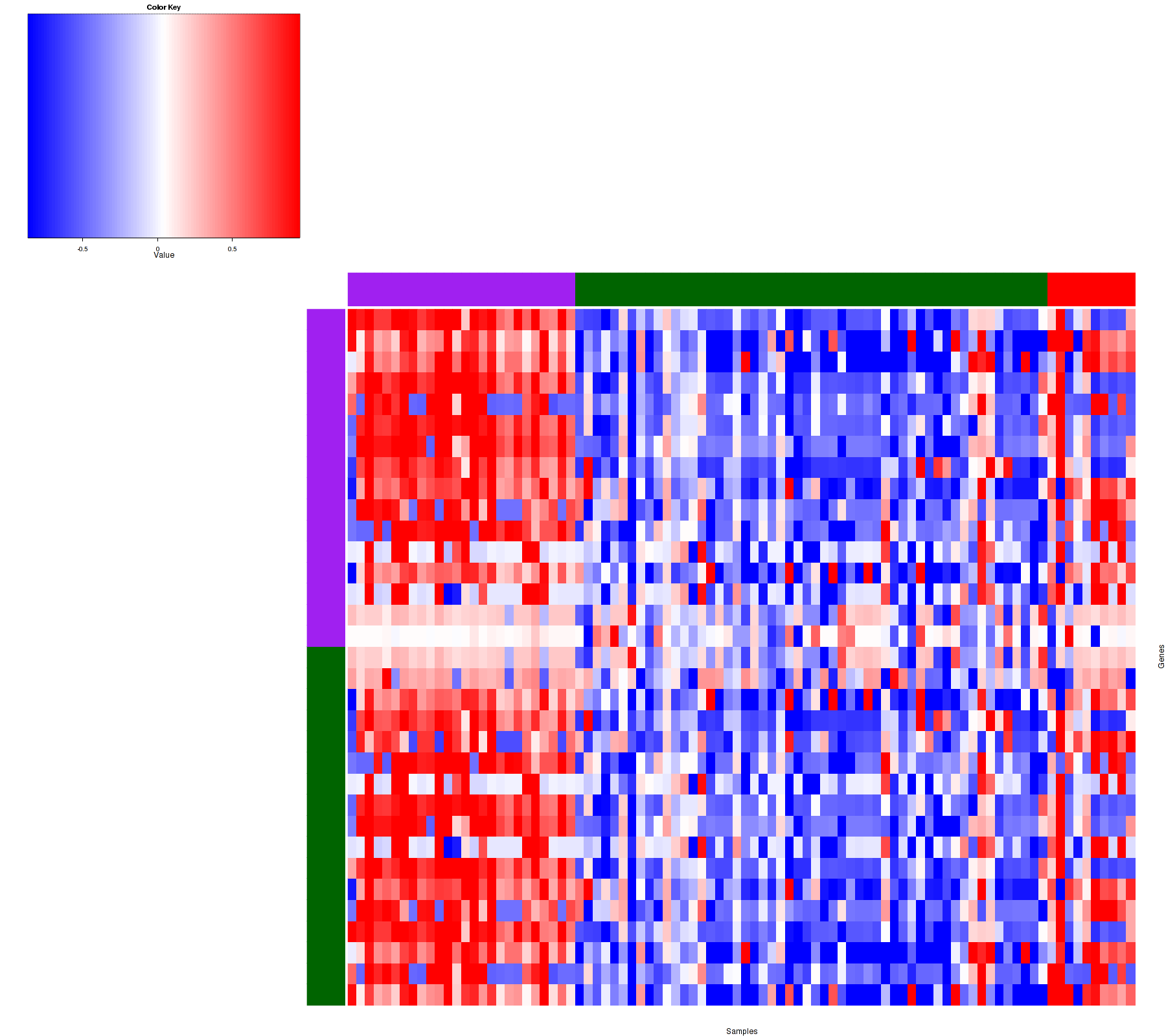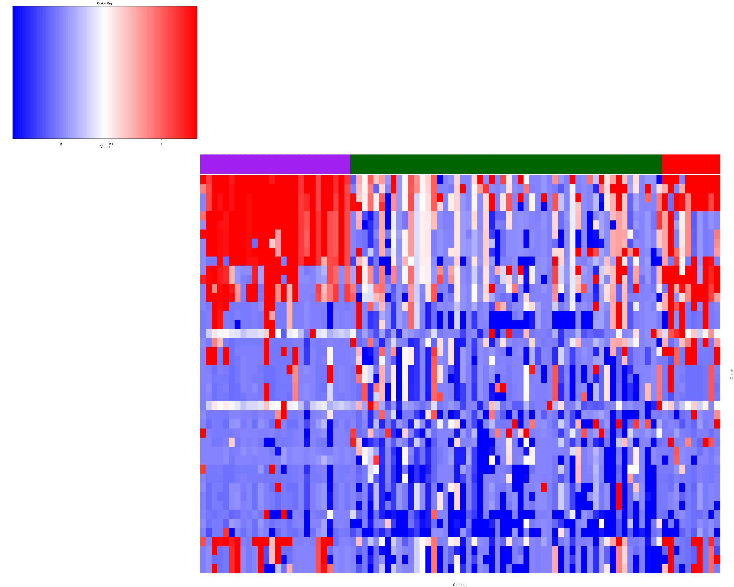 Figure 1. Get High-res Image Samples were separated into 3 clusters. Shown are 90 samples and 33 marker focal events. The color bar of the row indicates the marker focal events for the corresponding cluster.