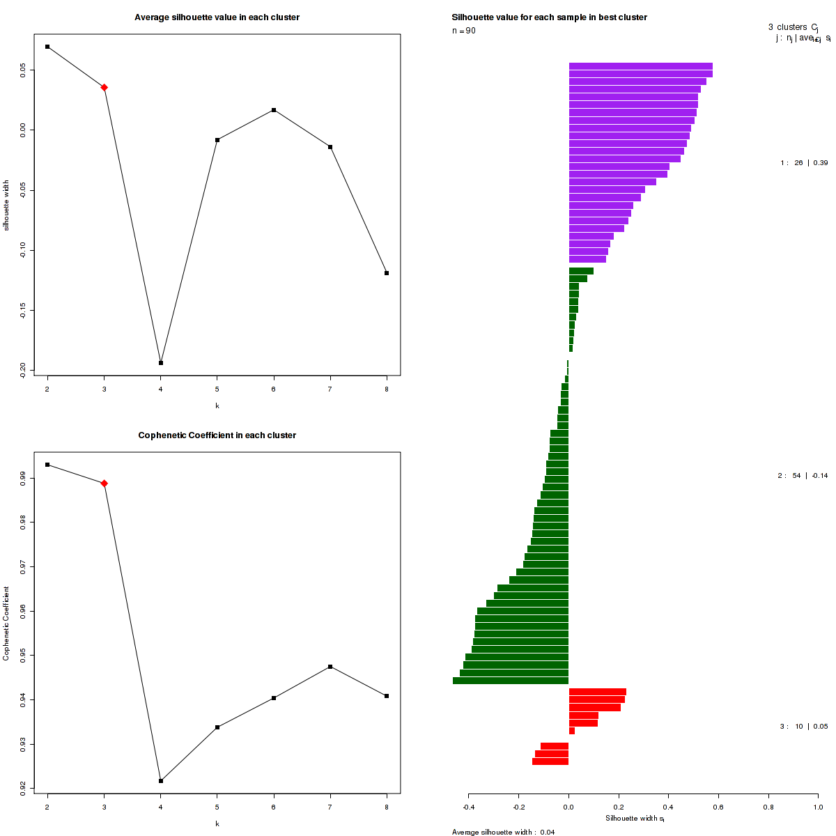 Figure 3. Get High-res Image The silhouette width was calculated for each sample and each value of k. The left panel shows the average silhouette width across all samples for each tested k (left panel). The right panels shows assignments of clusters to samples and the silhouette width of each sample for the most robust clustering.