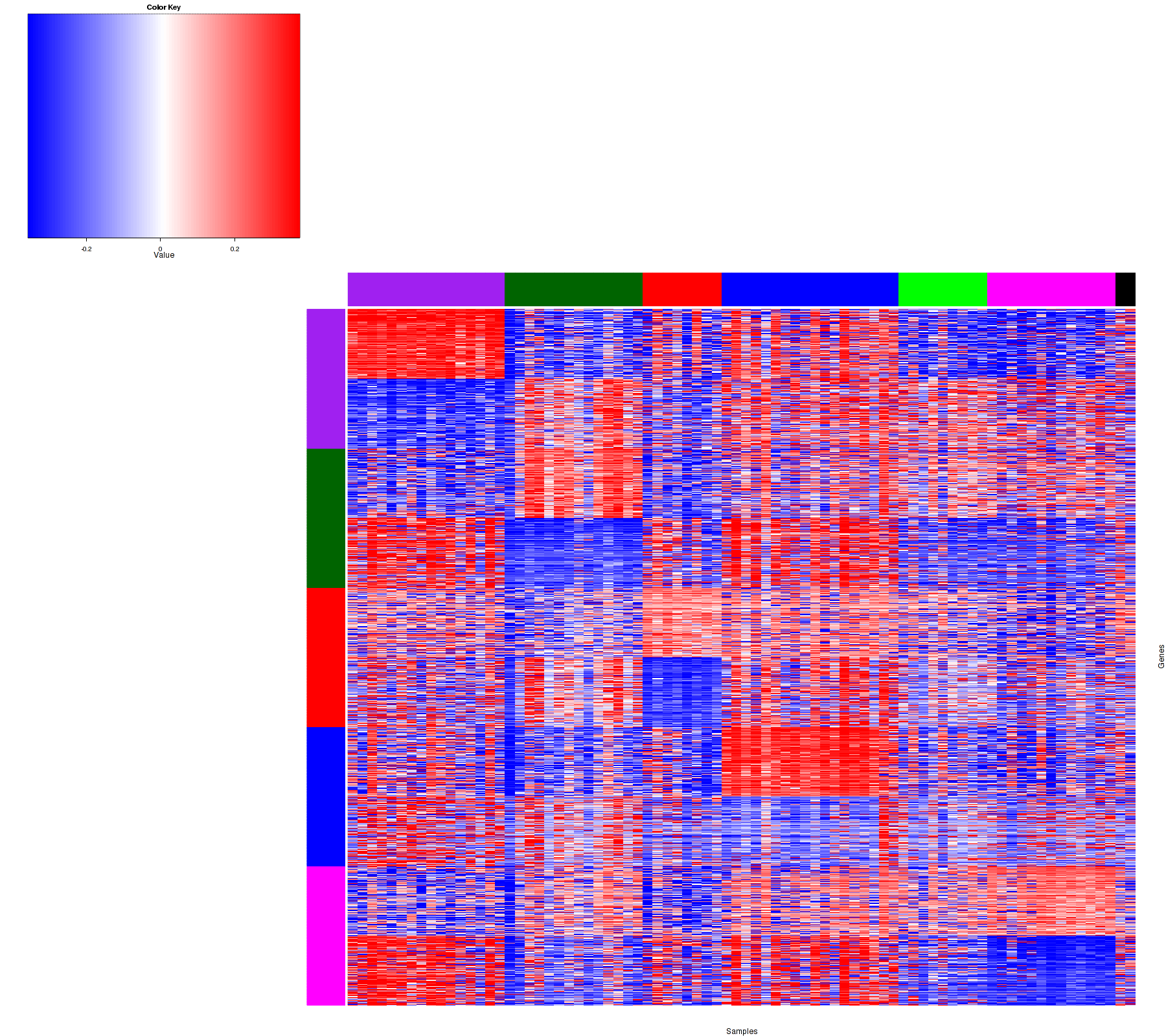 Figure 1. Get High-res Image Samples were separated into 7 clusters. Shown are 80 samples and 1500 marker genes. The color bar of the row indicates the marker genes for the corresponding cluster.