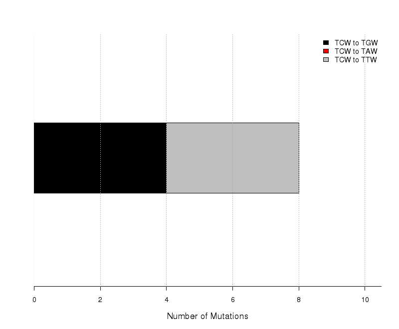 Figure 8. Get High-res Image The number of mutations categorized into three possible types of substitutions at the tCw motif (complementary mutations included) within C- or G-coordinated clusters. Numbers are calculated using the “Totals” row in the corresponding columns of the “*_sorted_sum_G_C_clusters.txt” file. Mutations caused by cytidine deamination in stretches of ssDNA caused by APOBEC mutagenesis are expected to be predominantly C-->T or C-->G with very few C-->A. Base substitution categories are shown within TCW context.