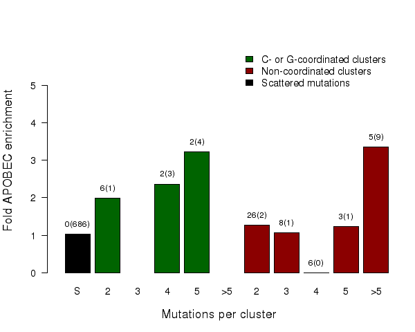Fold enrichment of the APOBEC mutation signature in clusters of different sizes of two categories – C- or G-coordinated or non-coordinated as well as in non-clustered (scattered) mutations. Smaller clusters usually show less enrichment because they have a higher chance to be formed by random mutations that occurred in close vicinity to each other. Values above the bars display the total number of mutation clusters in each class and in parentheses the total numbers of APOBEC signature mutations in a category. Values for fold enrichment as well as mutation and mutation cluster counts are taken from the following output files which can be downloaded from firehose_get (https://confluence.broadinstitute.org/display/GDAC/Download):
