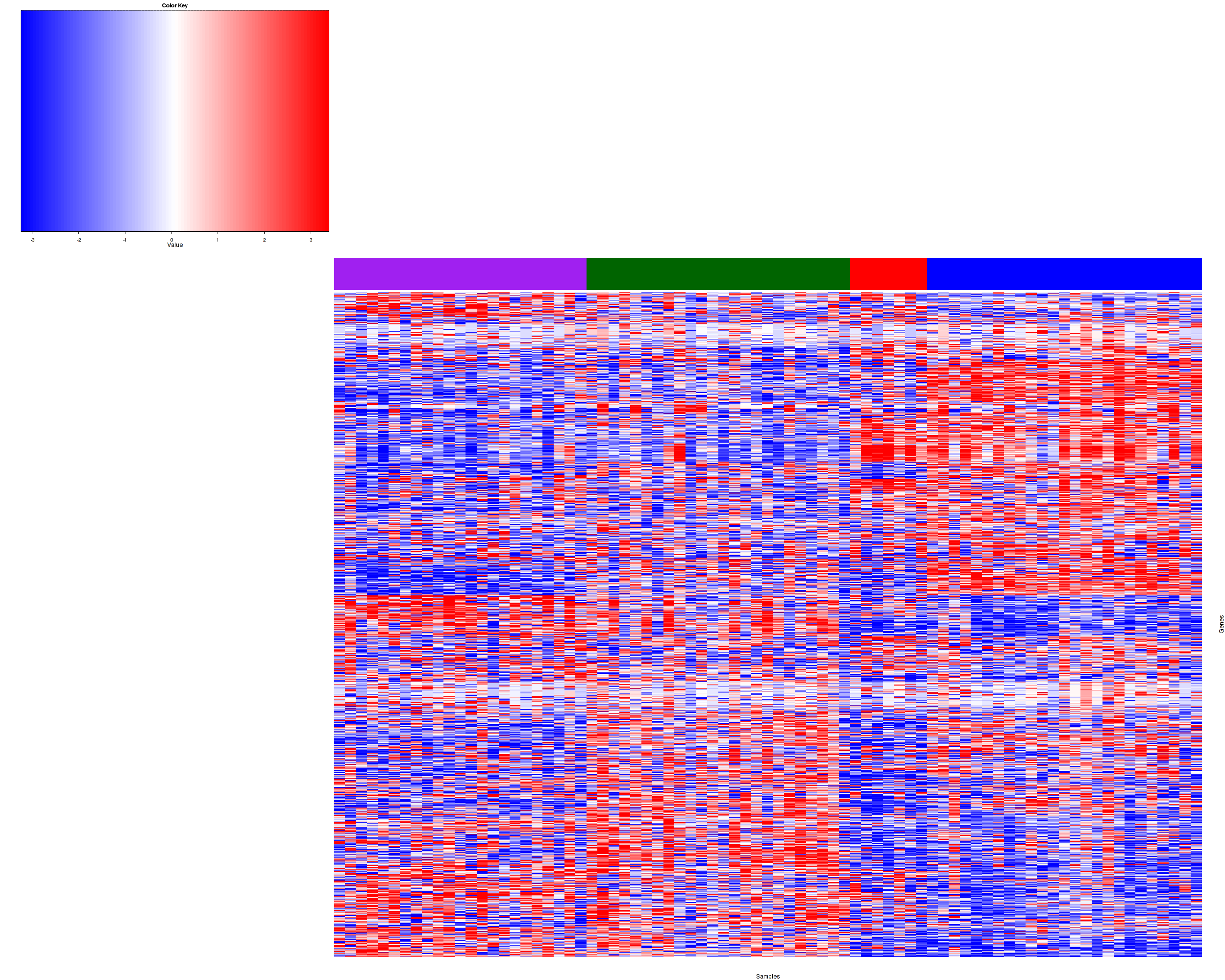 Figure 1. Get High-res Image Samples were separated into 4 clusters. Shown are 79 samples and 900 marker genes. The color bar of the row indicates the marker genes for the corresponding cluster.
