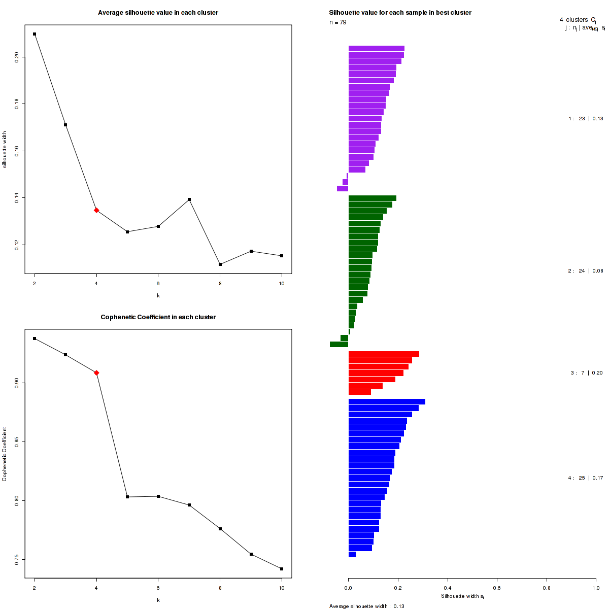 Figure 3. Get High-res Image The silhouette width was calculated for each sample and each value of k. The left upper panel shows the average silhouette width across all samples for each tested k (left upper panel). The left lower panel shows the Cophenetic Correlation Coefficients for each tested k. The right panel shows assignments of clusters to samples and the k silhouette width of each sample for the most robust clustering.