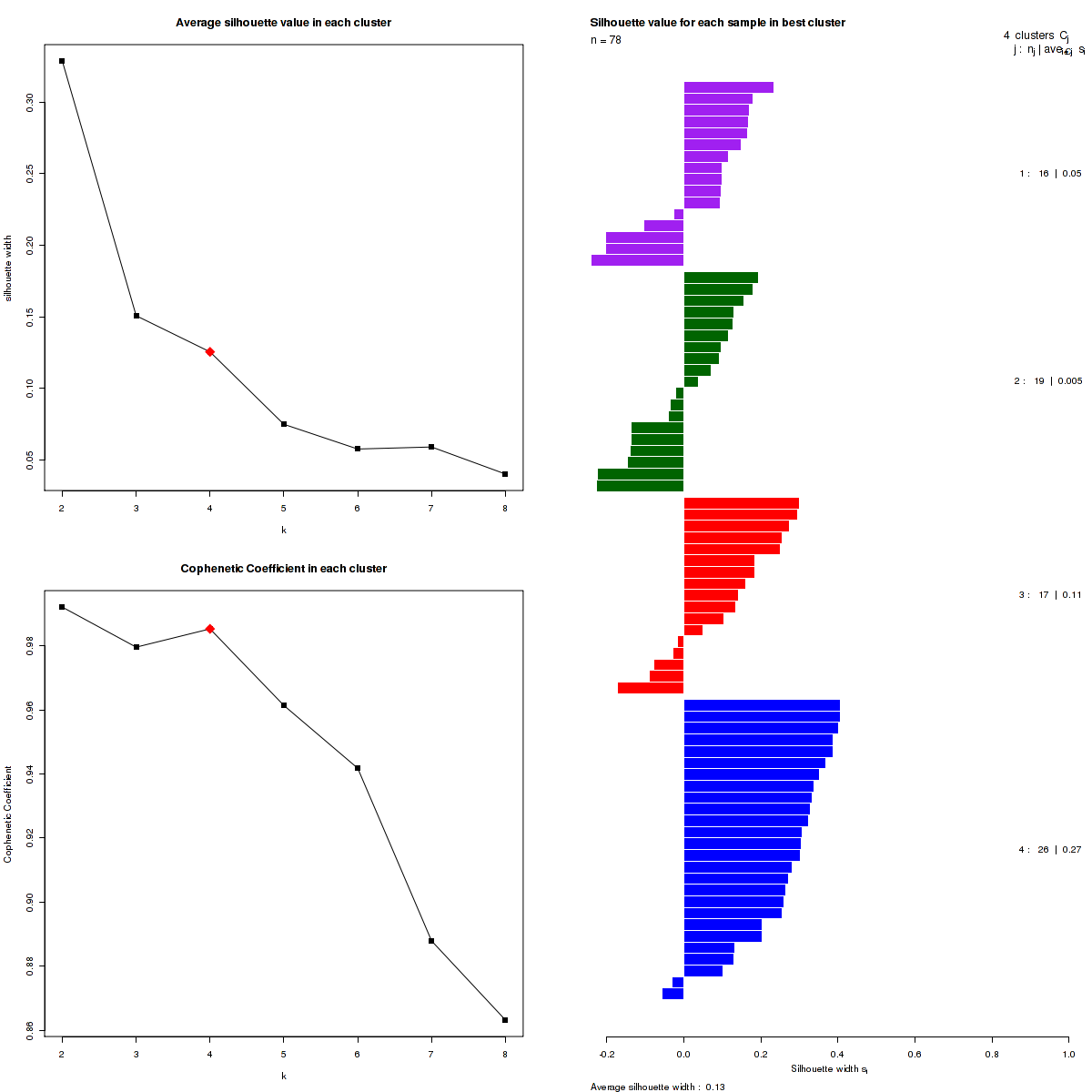 Figure 3. Get High-res Image The silhouette width was calculated for each sample and each value of k. The left upper panel shows the average silhouette width across all samples for each tested k (left upper panel). The left lower panel shows the Cophenetic Correlation Coefficients for each tested k. The right panel shows assignments of clusters to samples and the silhouette width of each sample for the most robust clustering.