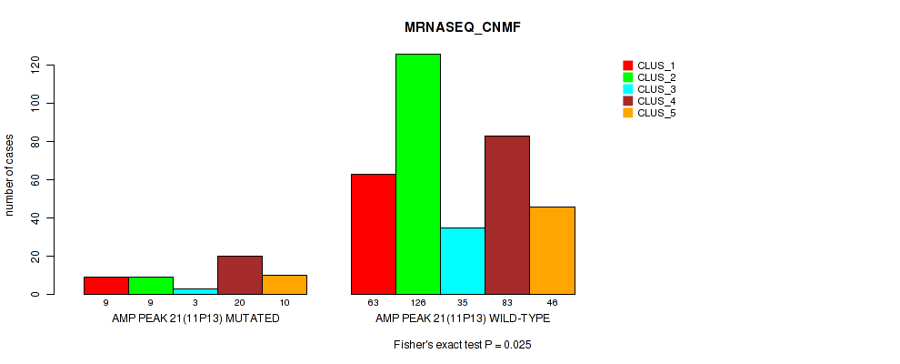 amp_11p13 cnv correlated to 'CN_CNMF', 'METHLYATION_CNMF', 'RPPA_CNMF', 'RPPA_CHIERARCHICAL', 'MRNASEQ_CNMF', 'MRNASEQ_CHIERARCHICAL', 'MIRSEQ_CNMF', 'MIRSEQ_MATURE_CNMF', and 'MIRSEQ_MATURE_CHIERARCHICAL'.