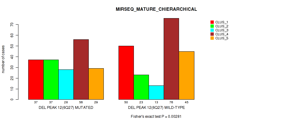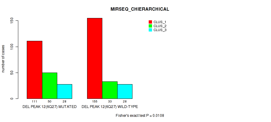 del_6q27 cnv correlated to 'CN_CNMF', 'MRNASEQ_CHIERARCHICAL', 'MIRSEQ_CNMF', 'MIRSEQ_CHIERARCHICAL', and 'MIRSEQ_MATURE_CHIERARCHICAL'.