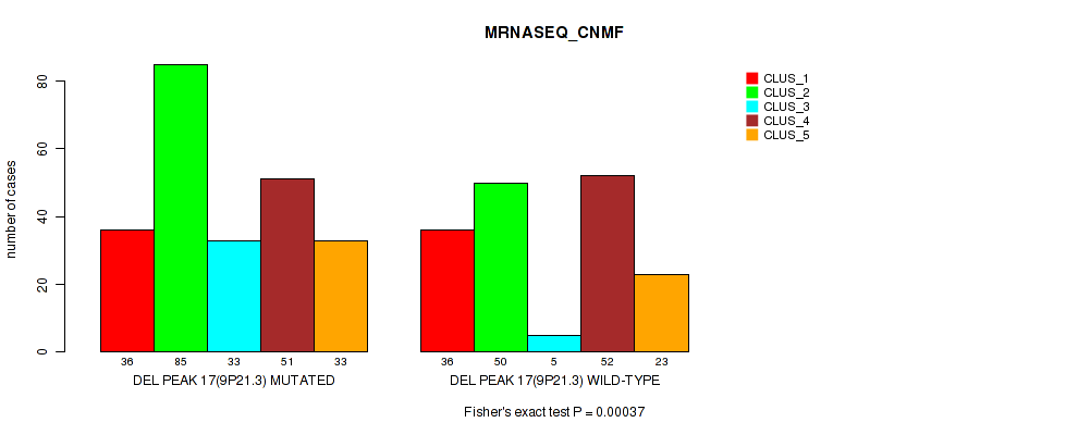 del_9p21.3 cnv correlated to 'CN_CNMF', 'RPPA_CHIERARCHICAL', 'MRNASEQ_CNMF', 'MRNASEQ_CHIERARCHICAL', 'MIRSEQ_MATURE_CNMF', and 'MIRSEQ_MATURE_CHIERARCHICAL'.