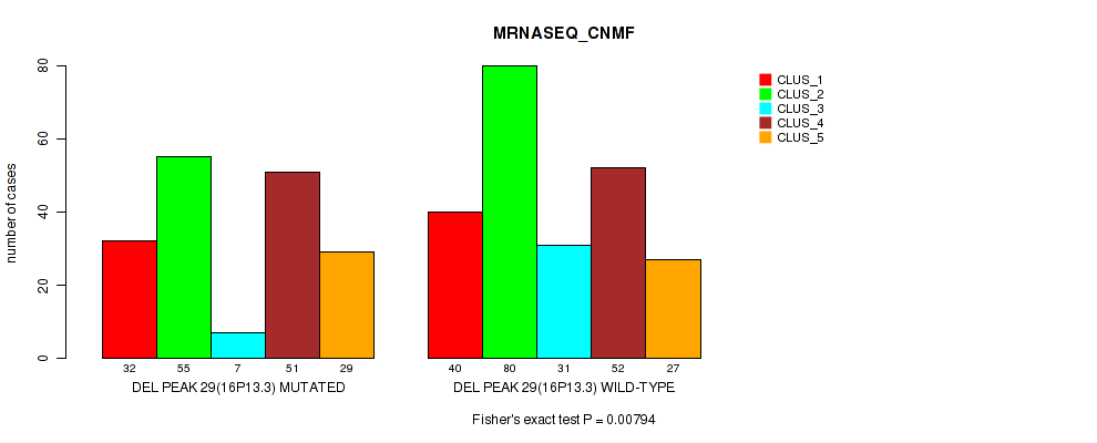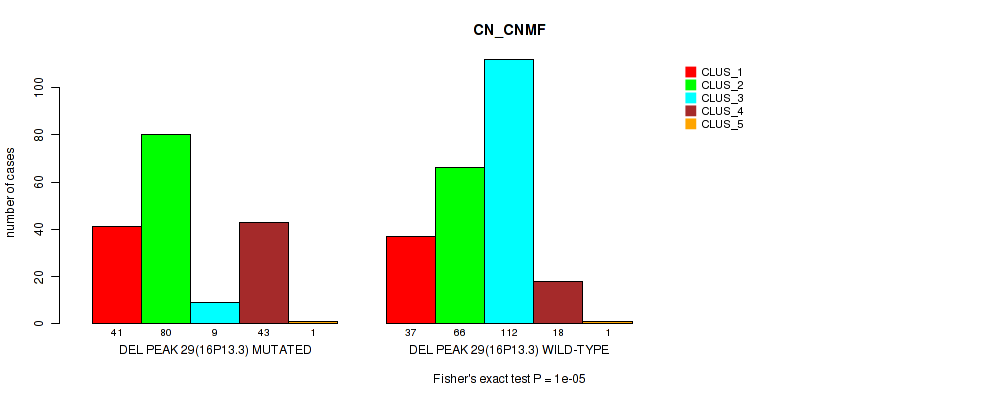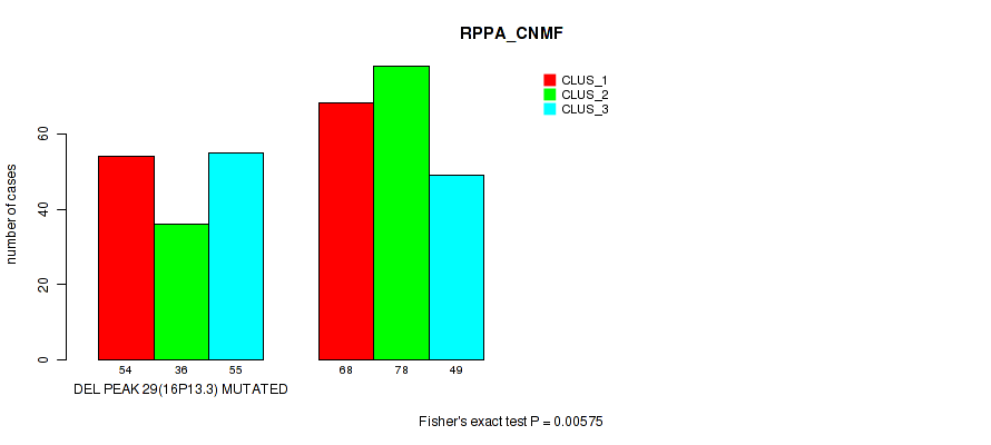 del_16p13.3 cnv correlated to 'CN_CNMF', 'METHLYATION_CNMF', 'RPPA_CNMF', and 'MRNASEQ_CNMF'.