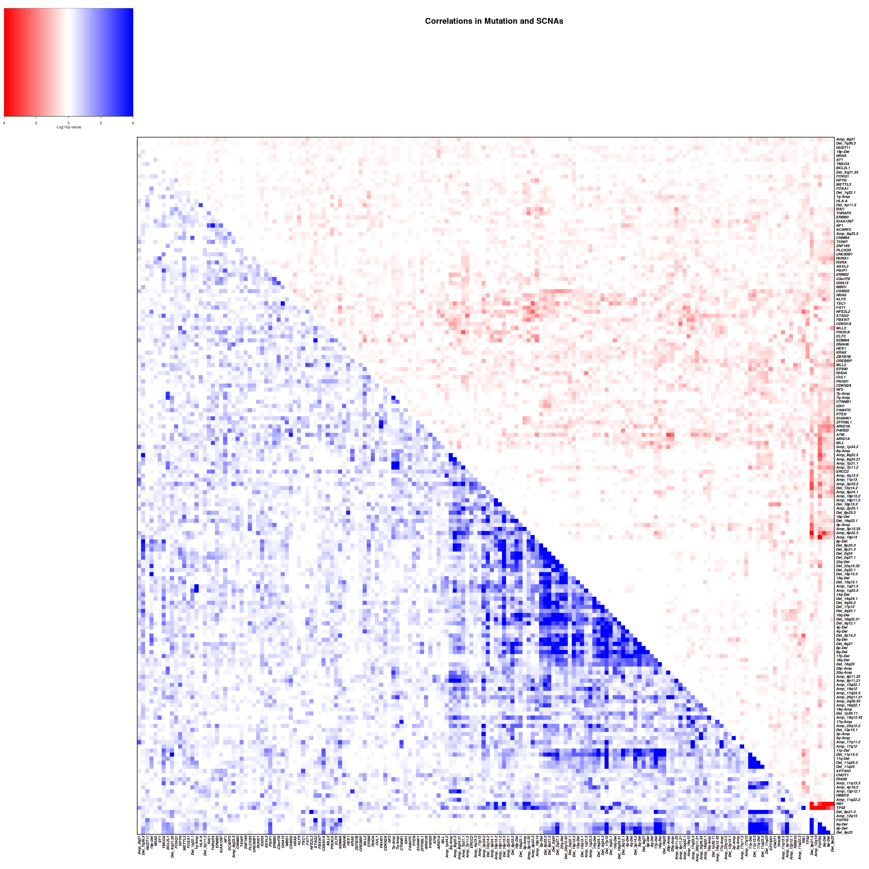 Figure 4. Get High-res Image Co-occurring and mutually-exclusive pairs for all copy number and mutation events. Blue means two events are co-occurring and red means two events are mutually-exclusive.