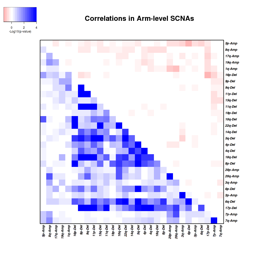 Figure 1. Get High-res Image Co-occurring and mutually-exclusive pairs for copy number variations of arm level events. Blue means two events are co-occurring and red means two events are mutually-exclusive.