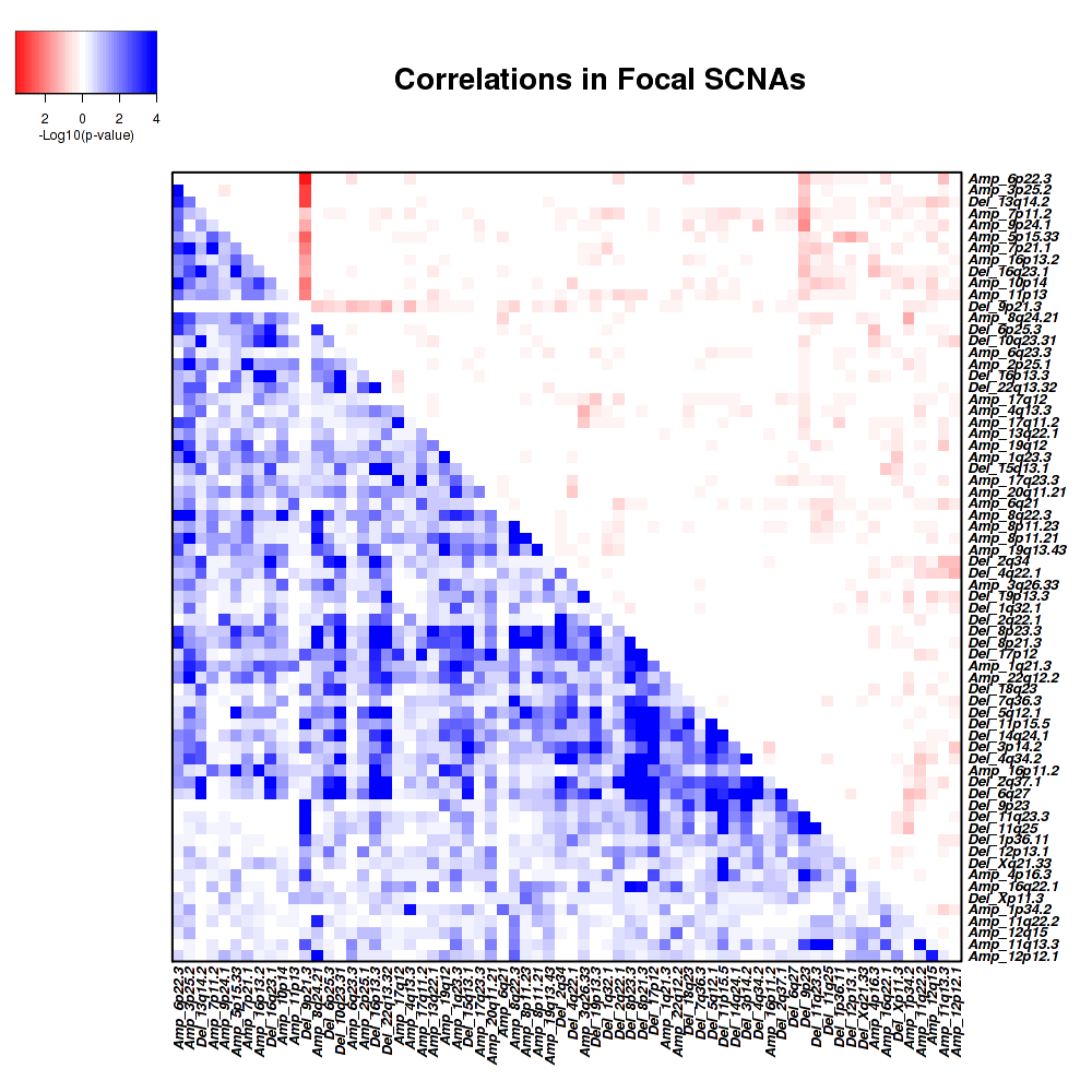 Figure 2. Get High-res Image Co-occurring and mutually-exclusive pairs for copy number variations of focal events. Blue means two events are co-occurring and red means two events are mutually-exclusive.