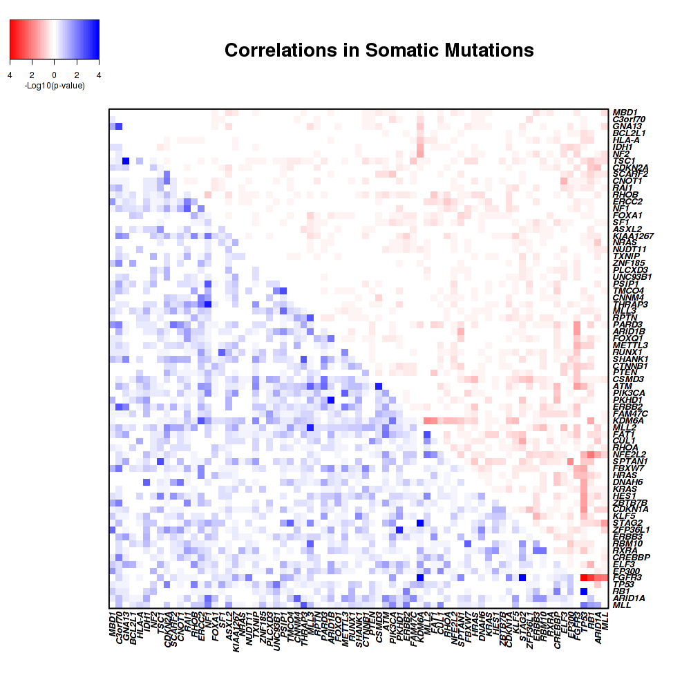 Figure 3. Get High-res Image Co-occurring and mutually-exclusive pairs for significantly mutated genes. Blue means two events are co-occurring and red means two events are mutually-exclusive.