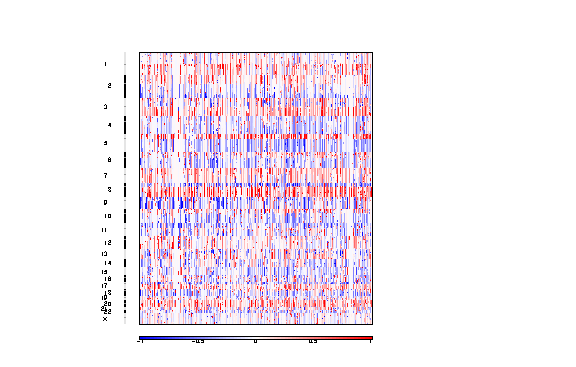A table of chromosome arm amplification levels for each sample. Each row is a chromosome arm, and each column a sample. The data are in units of absolute copy number -2.
