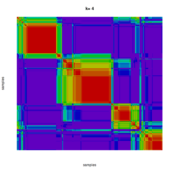 Figure 4. Get High-res Image The consensus matrix after clustering shows 4 clusters with limited overlap between clusters.