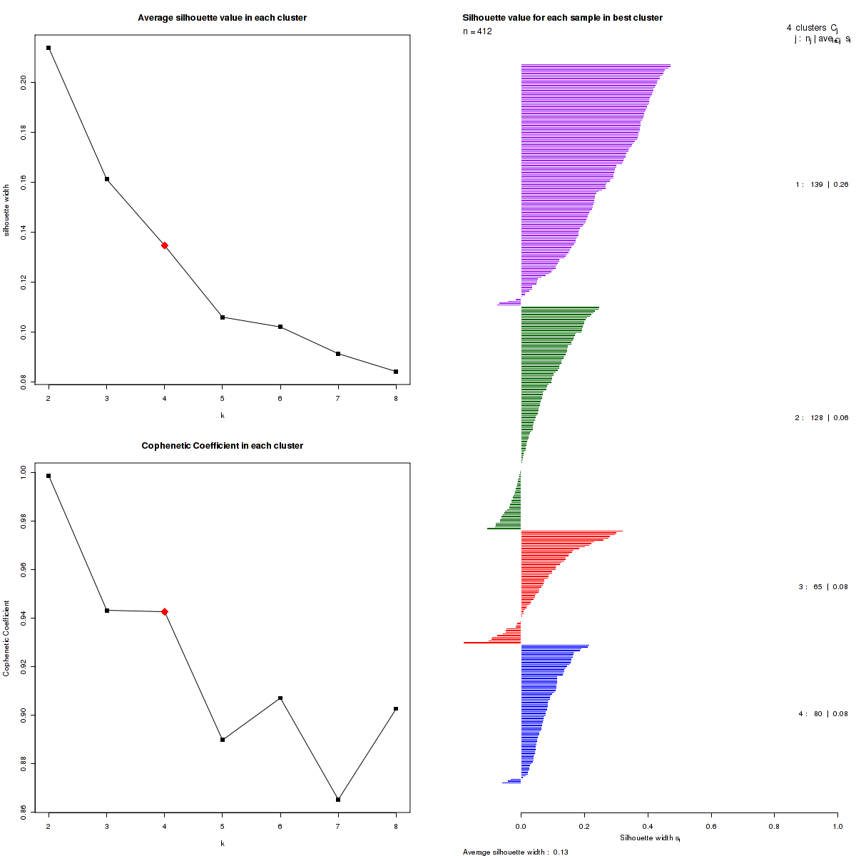 The most robust consensus NMF clustering of 412 samples using the 9502 most variable genes was identified for k = 4 clusters. We computed the clustering for k = 2 to k = 10 and uused the cophenetic correlation coefficient and the average silhouette width calculation to determine the robust clusters.