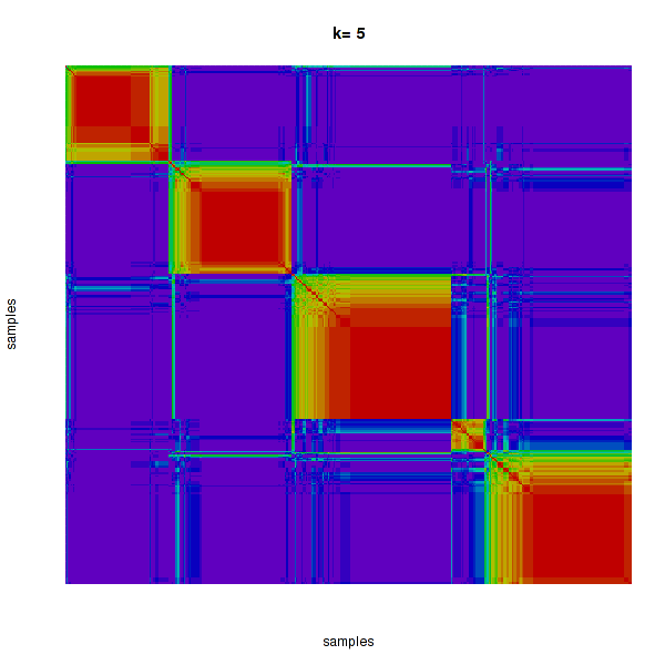 Figure 4. Get High-res Image The consensus matrix after clustering shows 5 clusters with limited overlap between clusters.