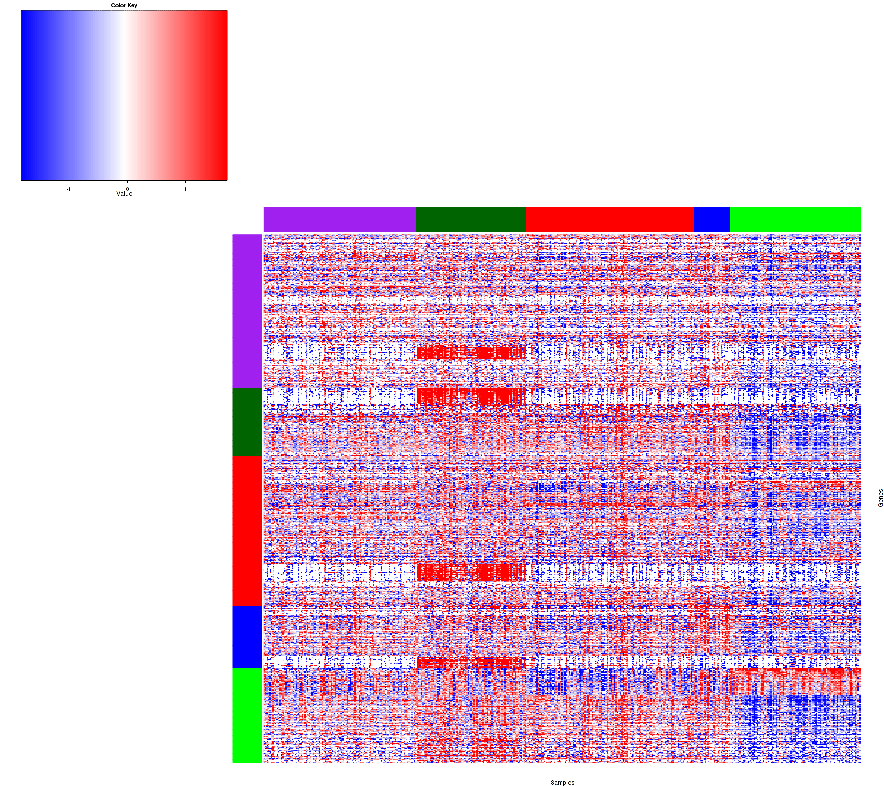 Figure 1. Get High-res Image Samples were separated into 5 clusters. Shown are 409 samples and 1163 marker miRs. The color bar of the row indicates the marker miRs for the corresponding cluster.