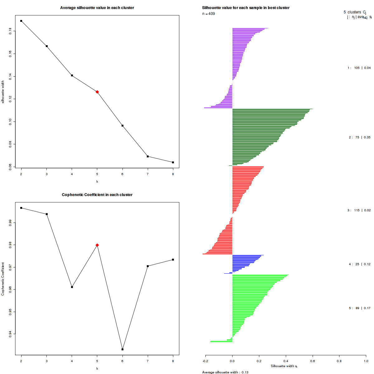Figure 3. Get High-res Image The silhouette width was calculated for each sample and each value of k. The left upper panel shows the average silhouette width across all samples for each tested k (left upper panel). The left lower panel shows the Cophenetic Correlation Coefficients for each tested k. The right panel shows assignments of clusters to samples and the silhouette width of each sample for the most robust clustering.