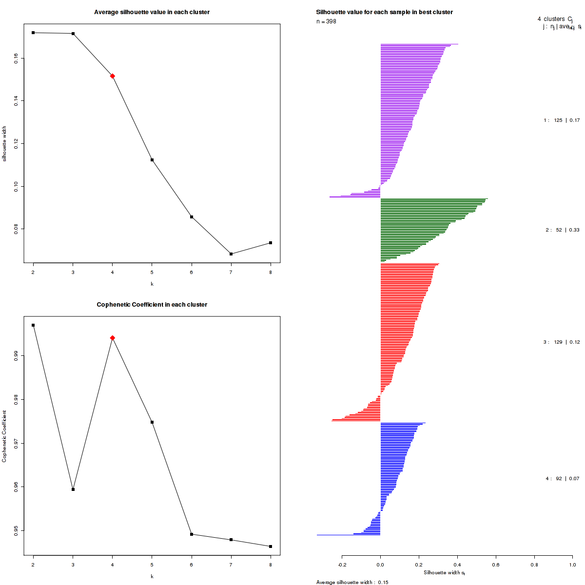 Figure 3. Get High-res Image The silhouette width was calculated for each sample and each value of k. The left upper panel shows the average silhouette width across all samples for each tested k (left upper panel). The left lower panel shows the Cophenetic Correlation Coefficients for each tested k. The right panel shows assignments of clusters to samples and the silhouette width of each sample for the most robust clustering.