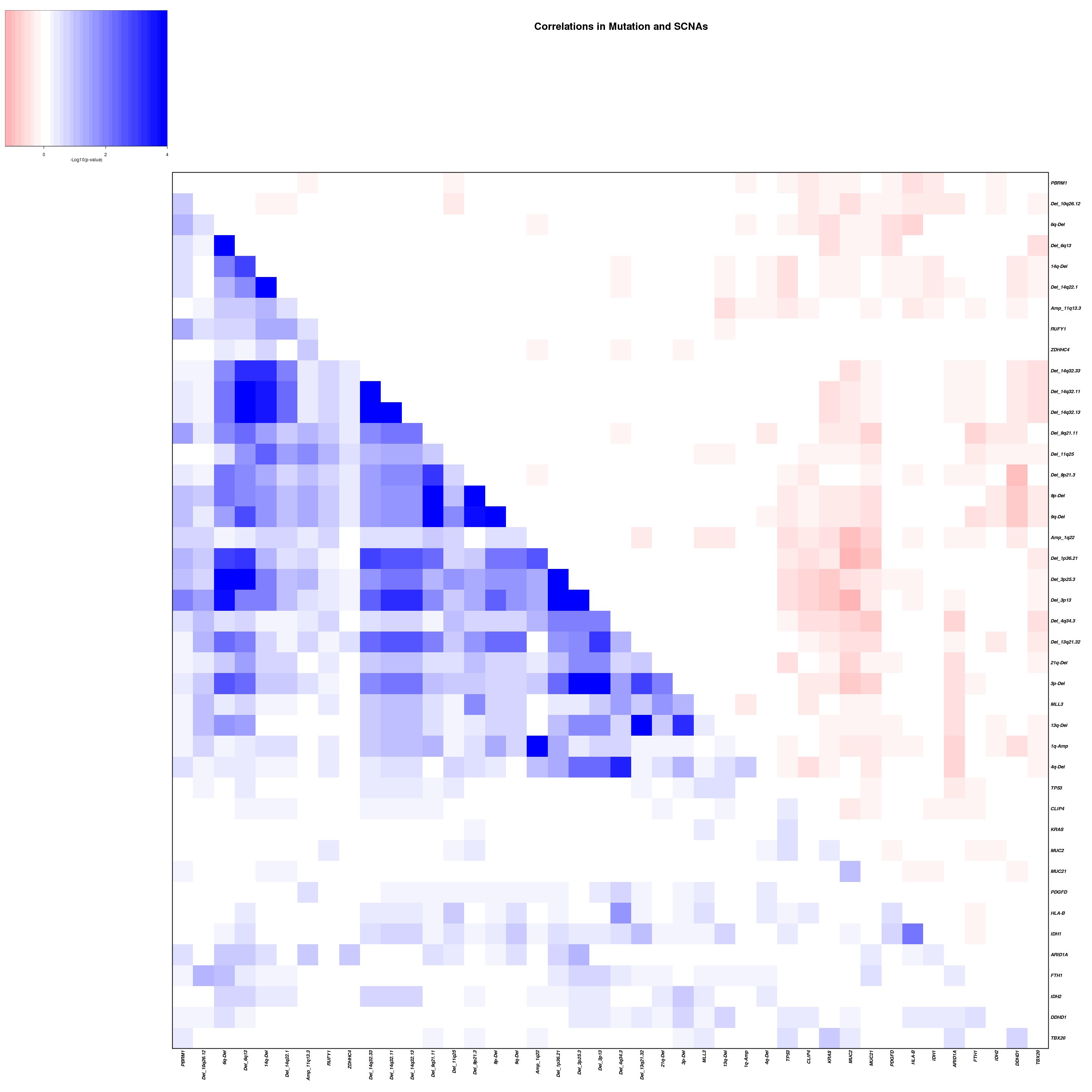 Figure 4. Get High-res Image Co-occurring and mutually-exclusive pairs for all copy number and mutation events. Blue means two events are co-occurring and red means two events are mutually-exclusive.