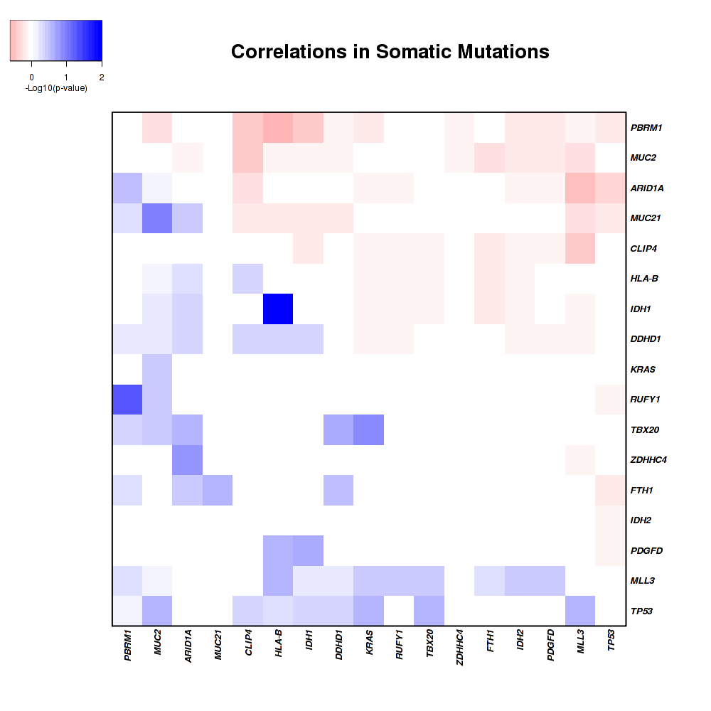 Figure 3. Get High-res Image Co-occurring and mutually-exclusive pairs for significantly mutated genes. Blue means two events are co-occurring and red means two events are mutually-exclusive.