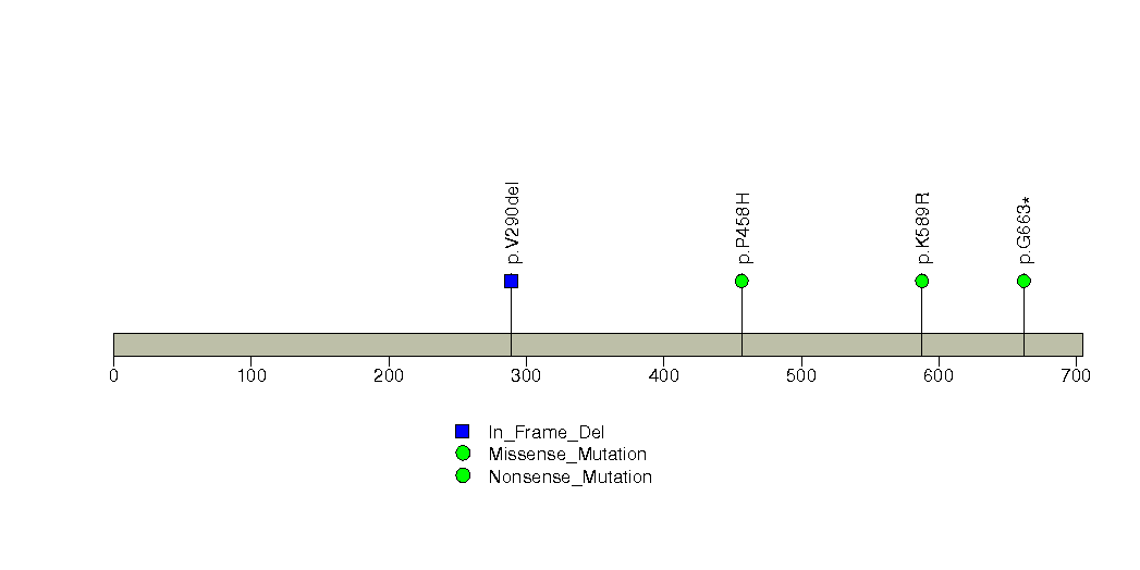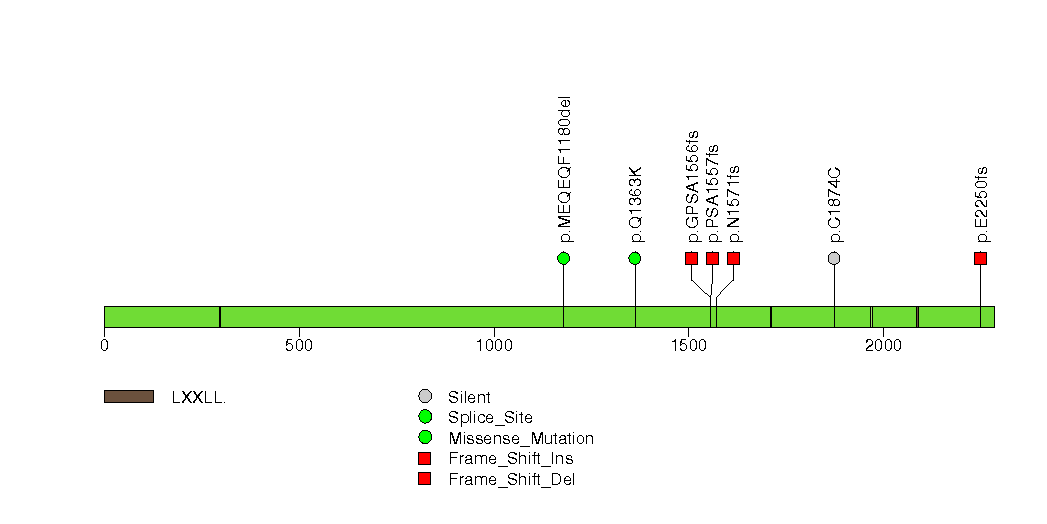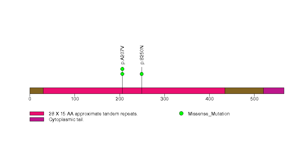 Figure S7. This figure depicts the distribution of mutations and mutation types across the MUC2 significant gene.