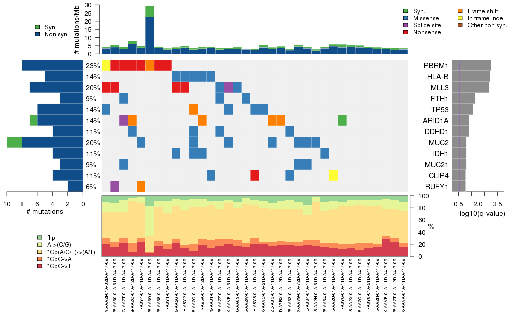 | 1 | PBRM1 | polybromo 1 | 5417 | 23 | 0 | 0 | 0 | 6 | 0 | 2 | 8 | 8 | 8 | 2.6e-13 | 1 | 0.75 | 7.7e-12 | 1.4e-07 |