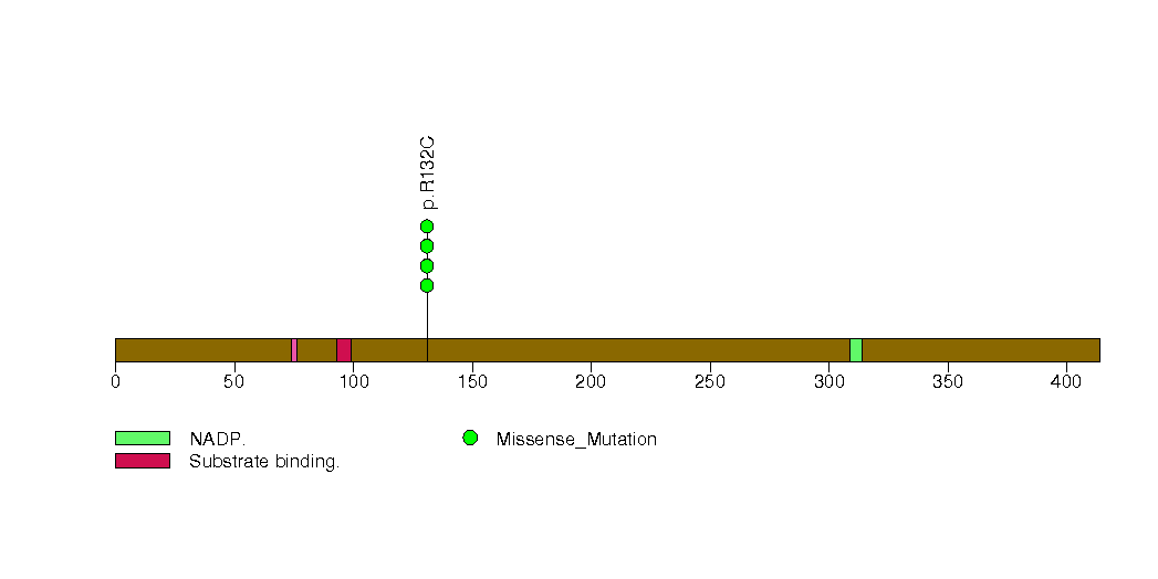 Figure S8. This figure depicts the distribution of mutations and mutation types across the IDH1 significant gene.