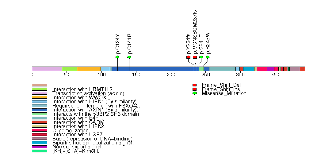 Figure S4. This figure depicts the distribution of mutations and mutation types across the TP53 significant gene.