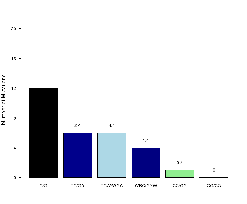 Figure 7. Get High-res Image The number of mutations within C- or G-coordinated clusters occurring in different known C- or G-specific mutation motifs. Counts are totaled among all samples. “C/G” – any mutation in C:G base pairs; “TC/GA” – any mutation in a less stringent APOBEC motif: tC (mutated nucleotide capitalized); “TCW/WGA” – any mutation in the stringent APOBEC motif: tCw; “WRC/GYW” – any mutation in the wrC motif for AID cytidine deaminase (r=A or G; y=C or T); “CC/GG” – any mutation in the cC motif for APOBEC3G; “CG/CG” – any mutation in the Cg (or CpG) motif frequently methylated (5me-C) and prone to deamination. Fold enrichments are calculated using values from the corresponding columns (including complementary mutations) in the “Totals” row of the “*_sorted_sum_G_C_clusters.txt” file. Fold enrichments for each signature (shown as numbers above the bars) are calculated the same as the fold enrichment for the APOBEC mutation motif. All three possible substitutions of C are included (i.e. to A, T and G). When tCw-specific APOBECs are the source of clustered mutations, both tC and tCw should be enriched with the latter being greater. Moreover, other C-specific mutation signatures should be depleted.
