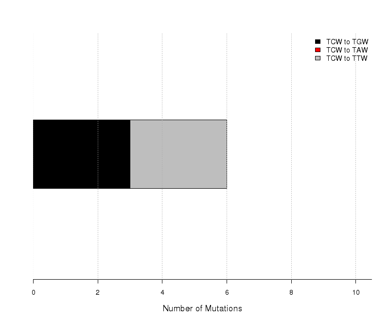 Figure 8. Get High-res Image The number of mutations categorized into three possible types of substitutions at the tCw motif (complementary mutations included) within C- or G-coordinated clusters. Numbers are calculated using the “Totals” row in the corresponding columns of the “*_sorted_sum_G_C_clusters.txt” file. Mutations caused by cytidine deamination in stretches of ssDNA caused by APOBEC mutagenesis are expected to be predominantly C-->T or C-->G with very few C-->A. Base substitution categories are shown within TCW context.
