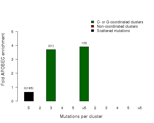 Fold enrichment of the APOBEC mutation signature in clusters of different sizes of two categories – C- or G-coordinated or non-coordinated as well as in non-clustered (scattered) mutations. Smaller clusters usually show less enrichment because they have a higher chance to be formed by random mutations that occurred in close vicinity to each other. Values above the bars display the total number of mutation clusters in each class and in parentheses the total numbers of APOBEC signature mutations in a category. Values for fold enrichment as well as mutation and mutation cluster counts are taken from the following output files which can be downloaded from firehose_get (https://confluence.broadinstitute.org/display/GDAC/Download):