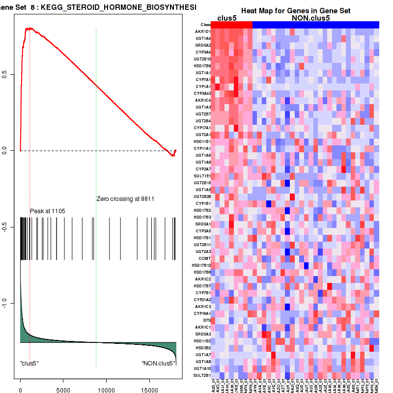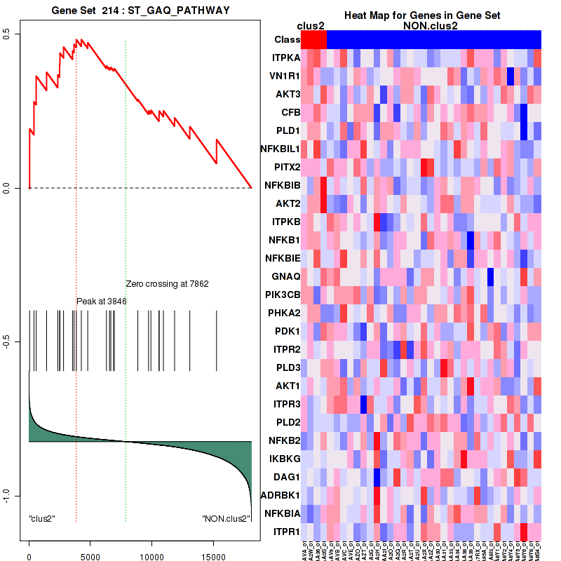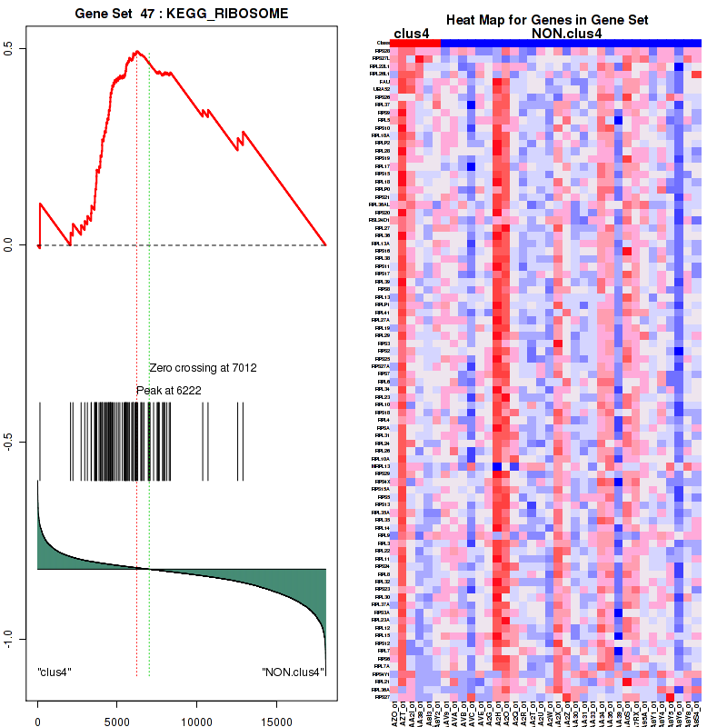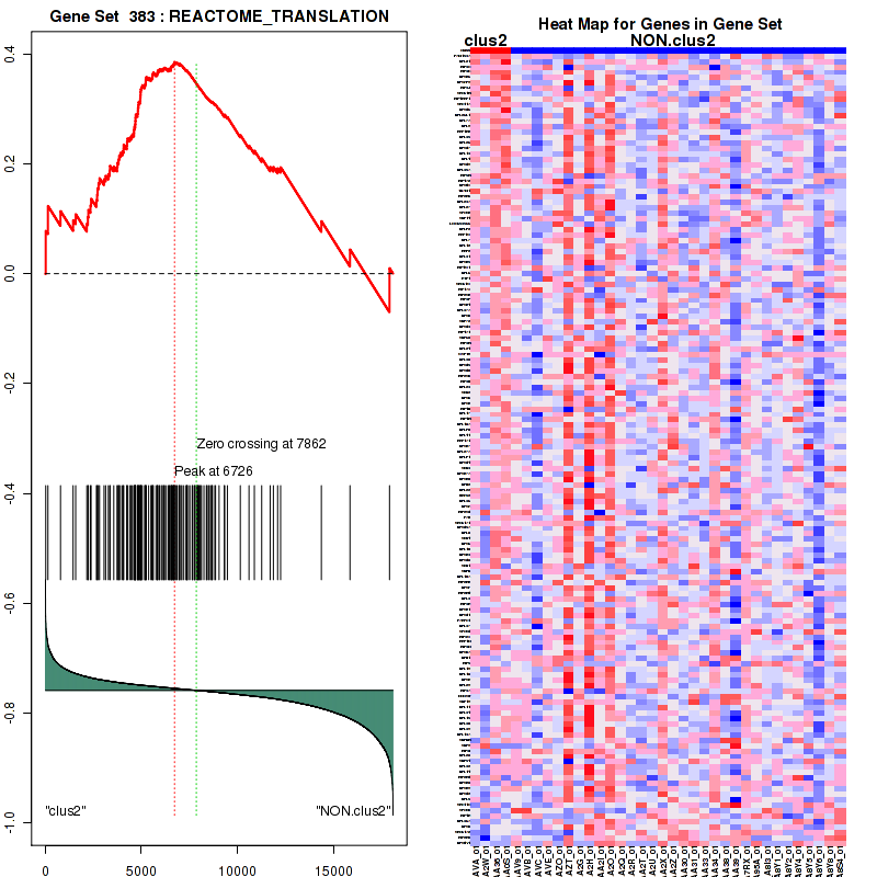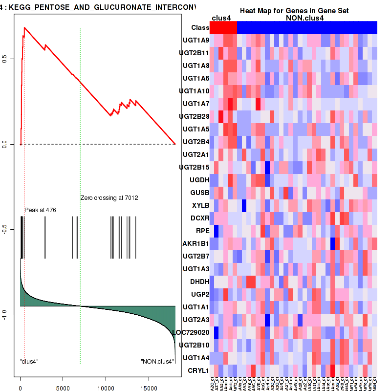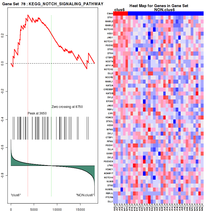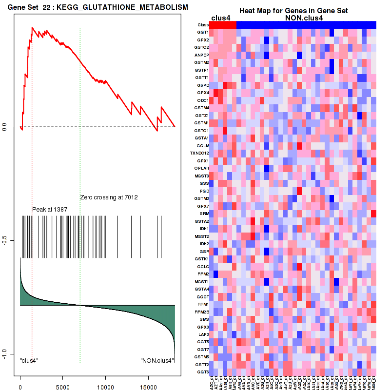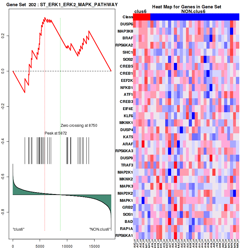 Table S1. Get Full Table This table shows a Running Enrichment Score (RES) of each gene in this pathway, that is, the enrichment score at this point in the ranked list of genes. All genes are ranked by Signal-to-Noise (S2N), a measure of similarity as default and are used to obtain ES matrix of all genes. In this way, GSEA tool uses expression pattern of not only overlapped genes but also not-overlapped genes to produce ES matrix.