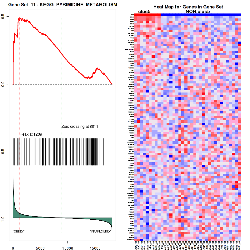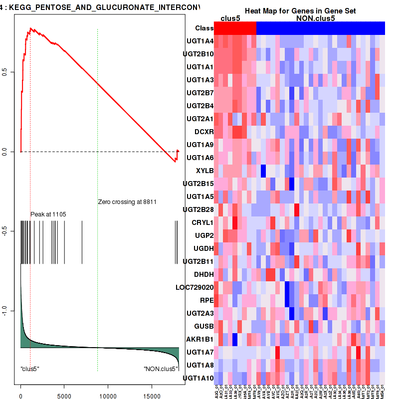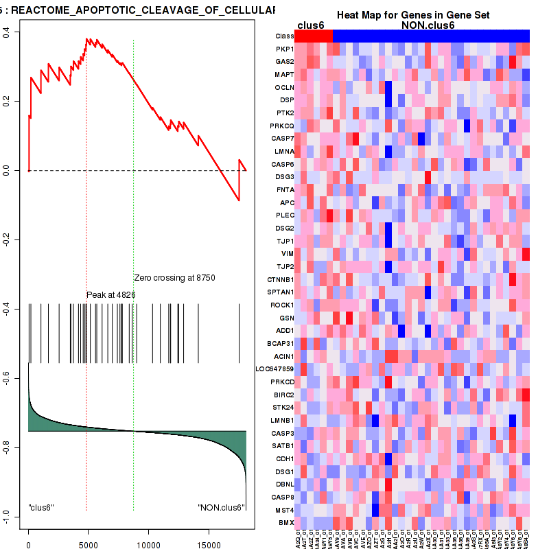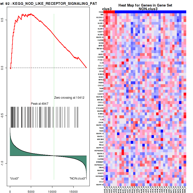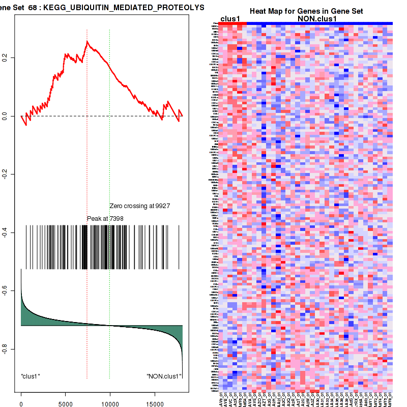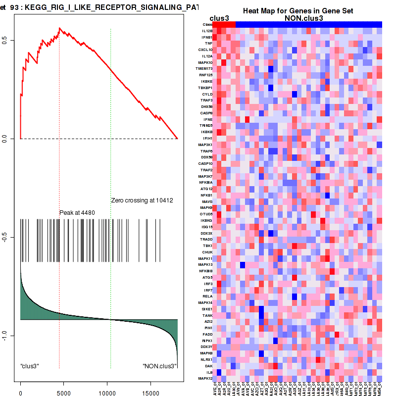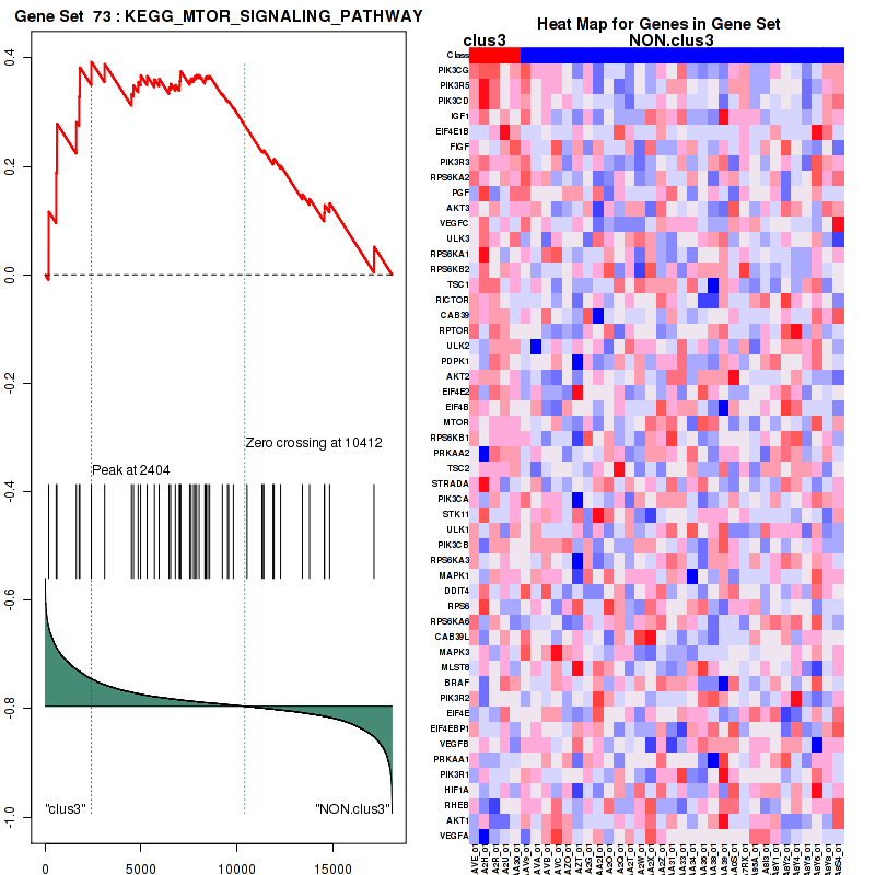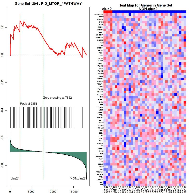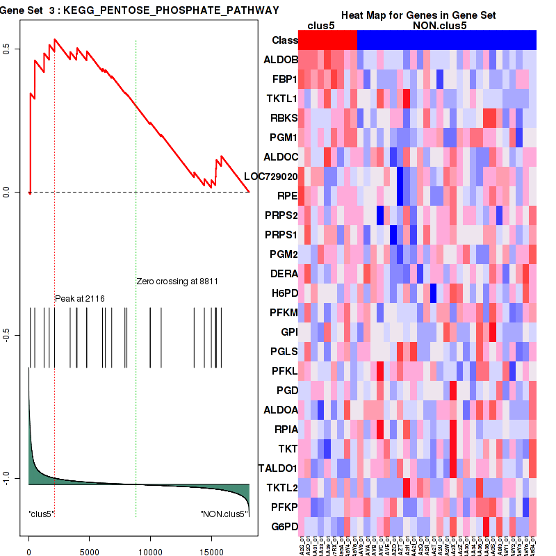 Table S1. Get Full Table This table shows a Running Enrichment Score (RES) of each gene in this pathway, that is, the enrichment score at this point in the ranked list of genes. All genes are ranked by Signal-to-Noise (S2N), a measure of similarity as default and are used to obtain ES matrix of all genes. In this way, GSEA tool uses expression pattern of not only overlapped genes but also not-overlapped genes to produce ES matrix.