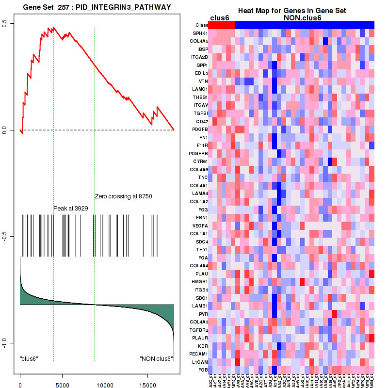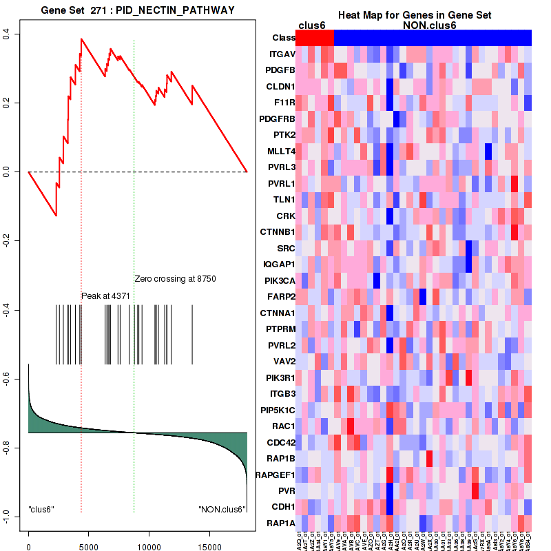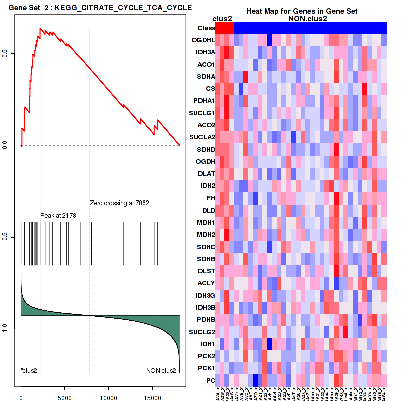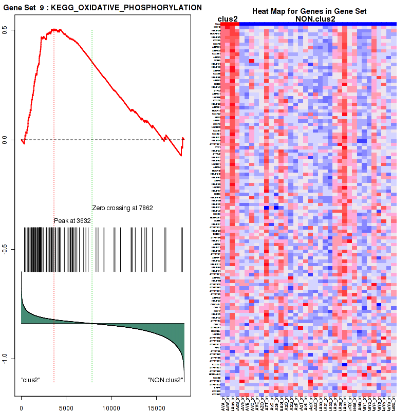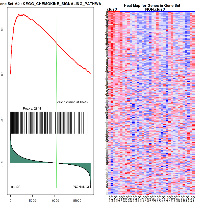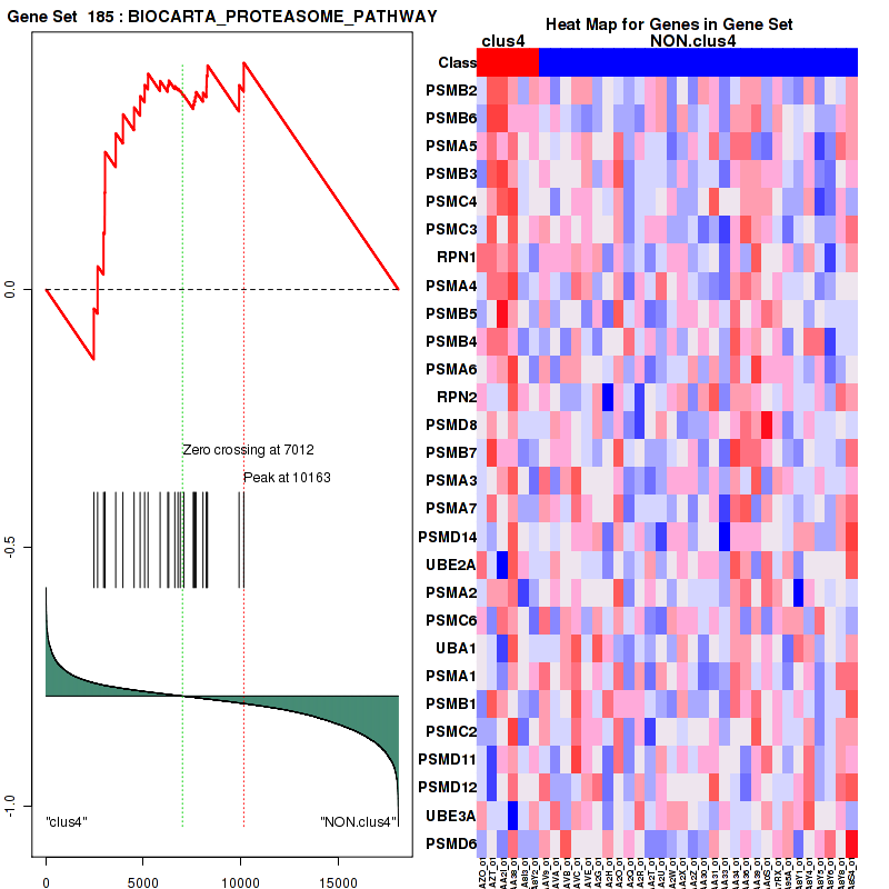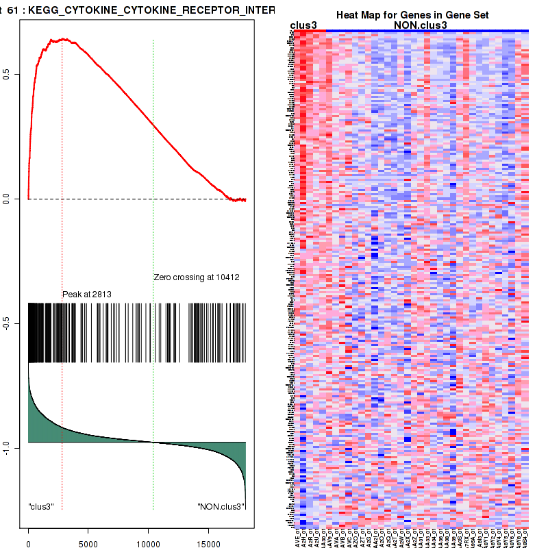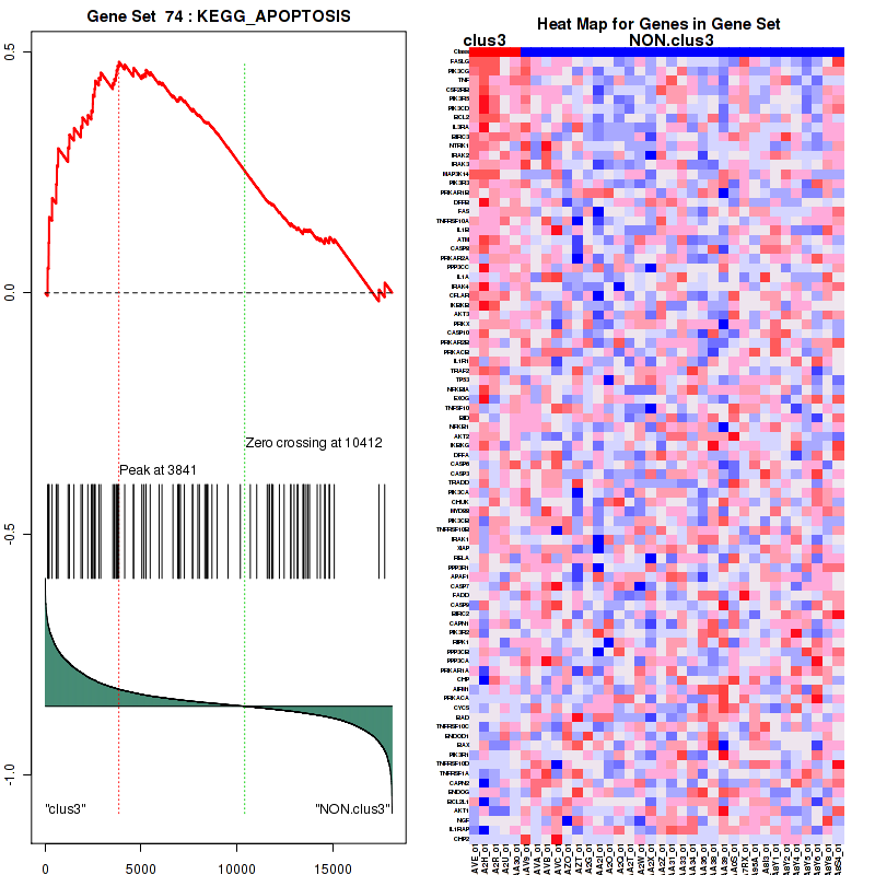 Table S1. Get Full Table This table shows a Running Enrichment Score (RES) of each gene in this pathway, that is, the enrichment score at this point in the ranked list of genes. All genes are ranked by Signal-to-Noise (S2N), a measure of similarity as default and are used to obtain ES matrix of all genes. In this way, GSEA tool uses expression pattern of not only overlapped genes but also not-overlapped genes to produce ES matrix.