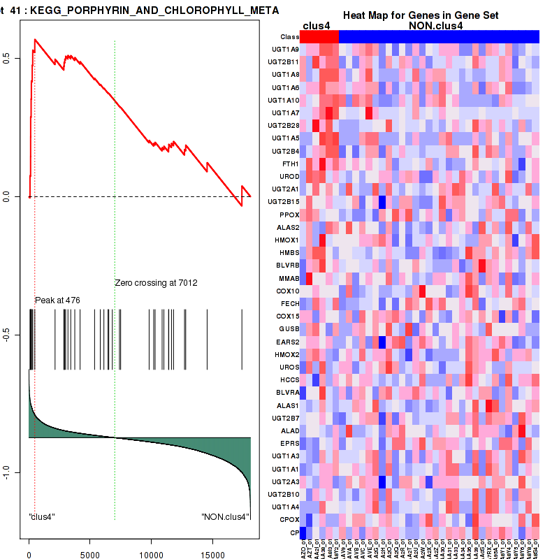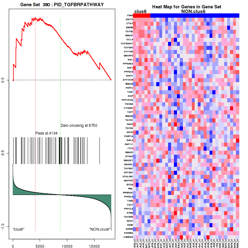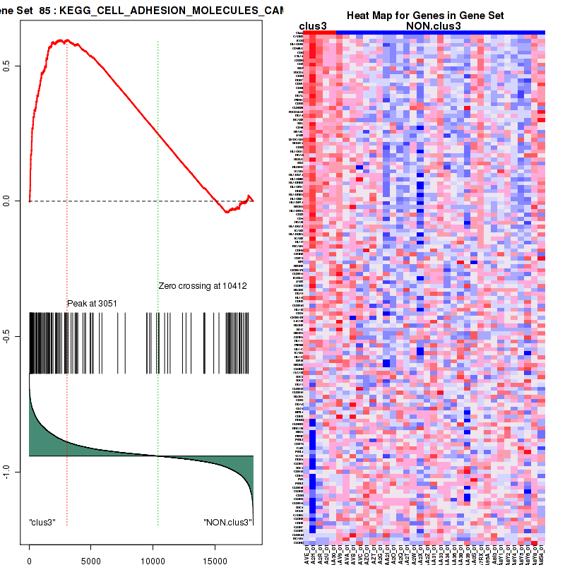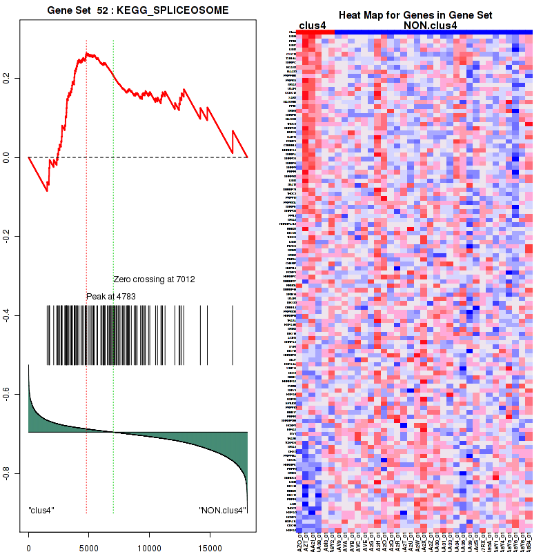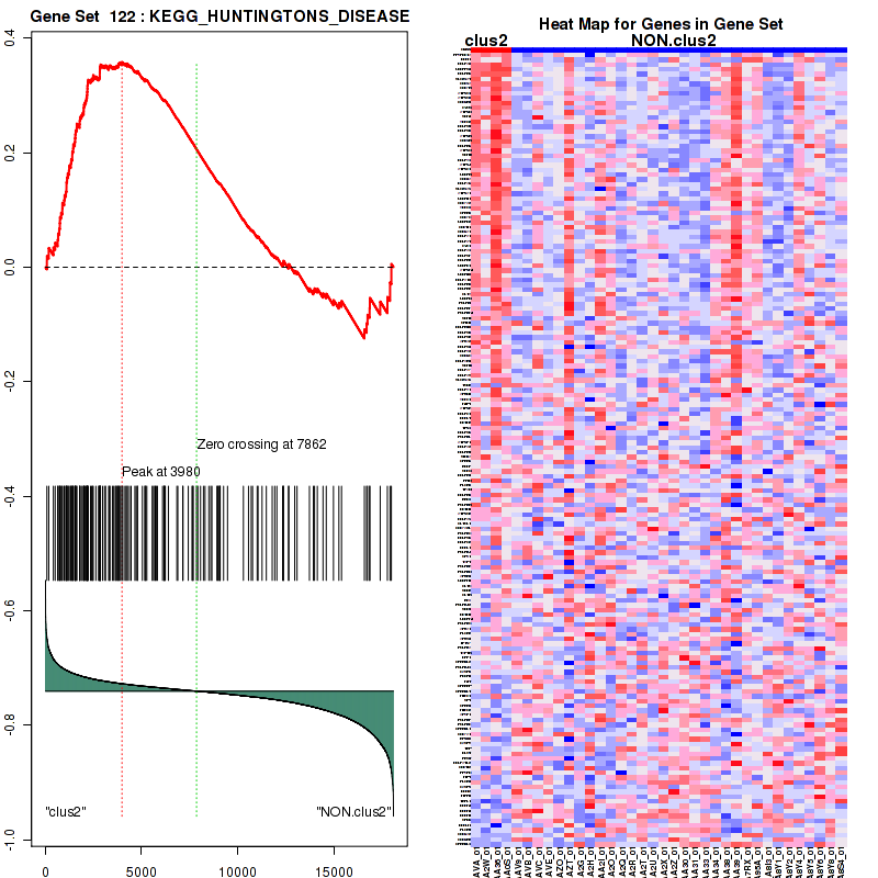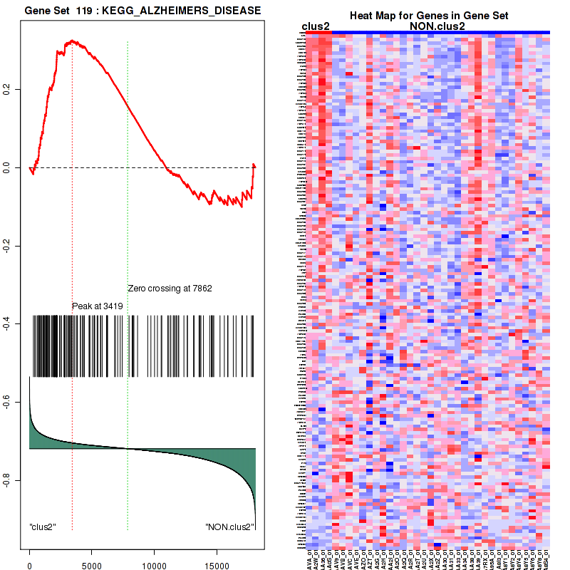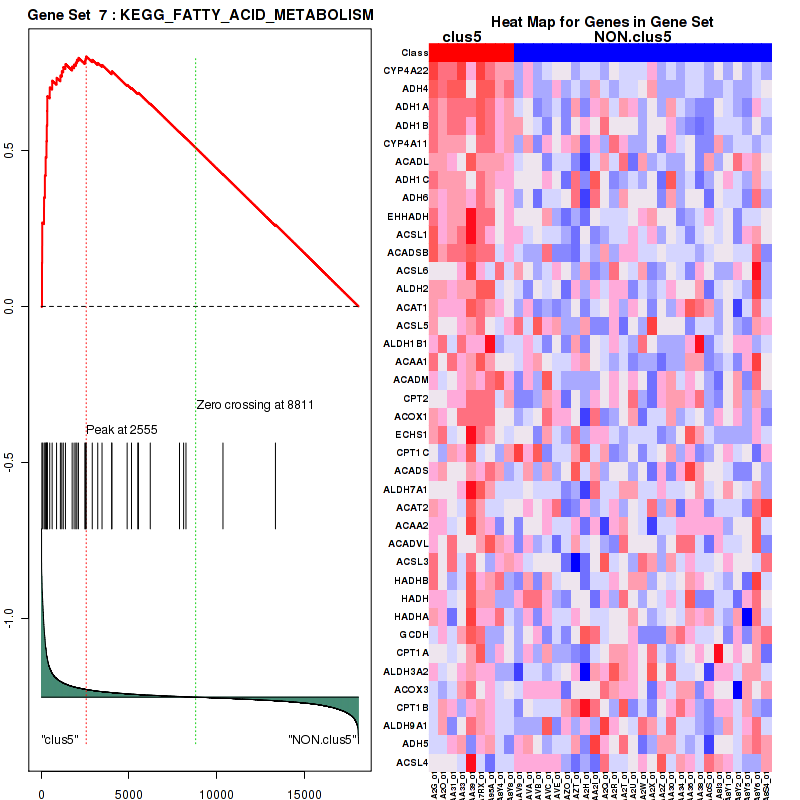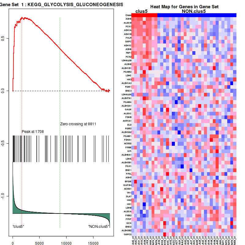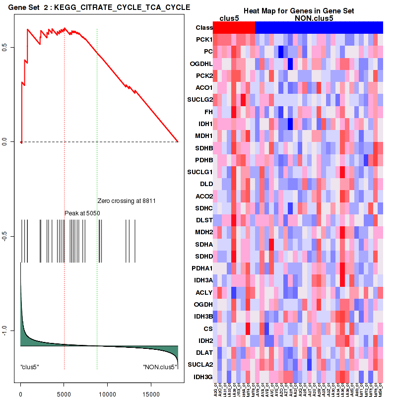 Table S1. Get Full Table This table shows a Running Enrichment Score (RES) of each gene in this pathway, that is, the enrichment score at this point in the ranked list of genes. All genes are ranked by Signal-to-Noise (S2N), a measure of similarity as default and are used to obtain ES matrix of all genes. In this way, GSEA tool uses expression pattern of not only overlapped genes but also not-overlapped genes to produce ES matrix.